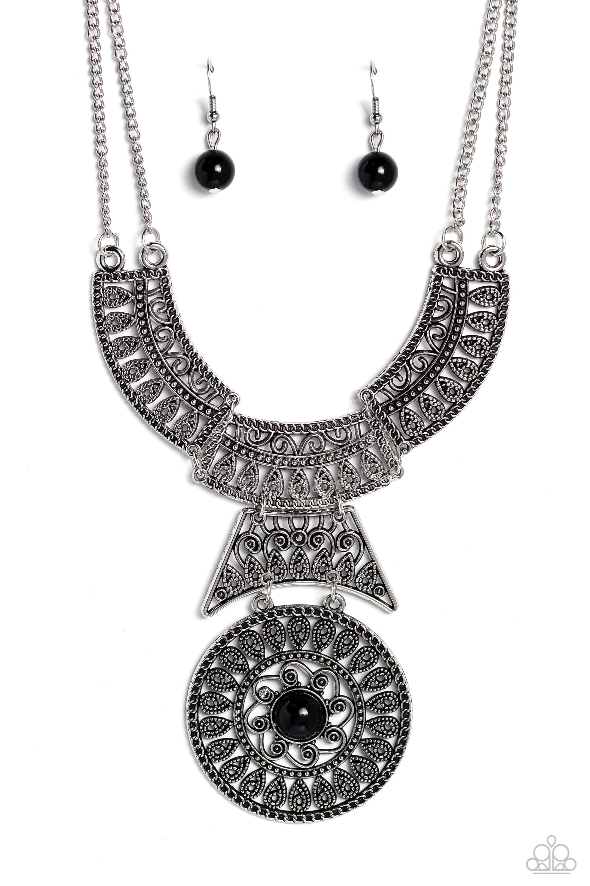 Rows of oversized silver filigree frames stack into a crescent-shape that is anchored by additional silver filigree frames that layer down the neckline. Featured in the center of the lowermost circular filigree frame, a glossy black bead, creates a hypnotic pendant that swings dramatically. The elaborate statement piece is suspended from a sleek double silver chain, emphasizing the whimsical curls emanating from the design. Features an adjustable clasp closure.