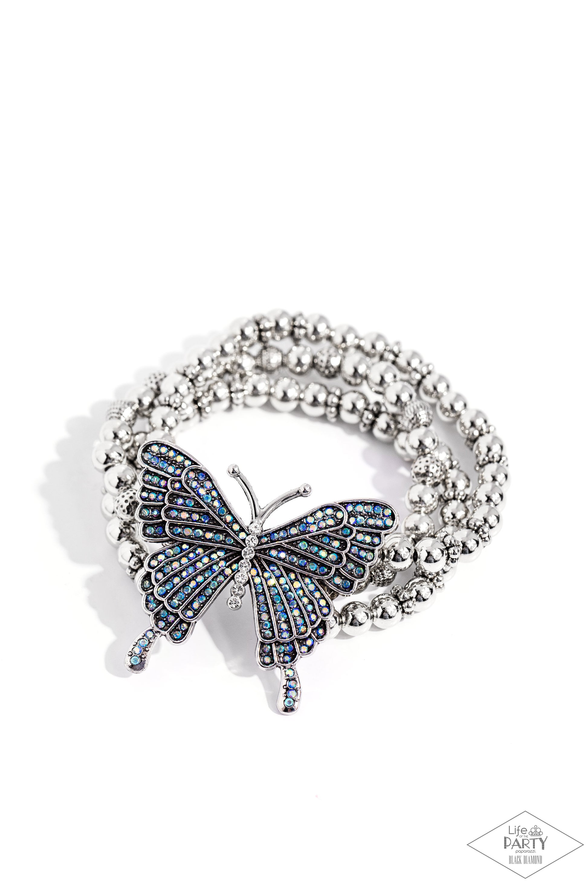 Strung along elastic stretchy bands, a trio of silver and textured silver beads and accents wrap around the wrist. Featured atop the beaded collection, an oversized silver butterfly, with intricate details, is sprinkled with dainty blue iridescent rhinestones across its wings and body, for a dramatically dazzling finish. Due to its prismatic palette, color may vary.