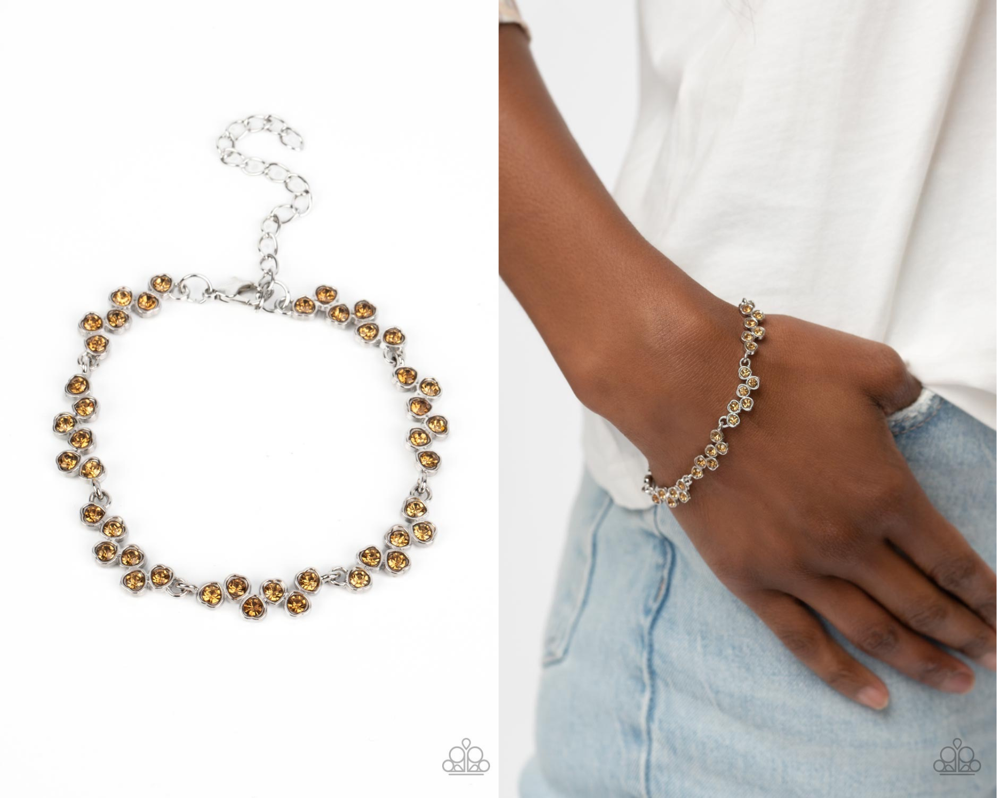 Set in dainty silver heart-shaped frames, staggered clusters of glassy topaz rhinestones delicately link into a flirtatious hint of sparkle around the wrist. Features an adjustable clasp closure.