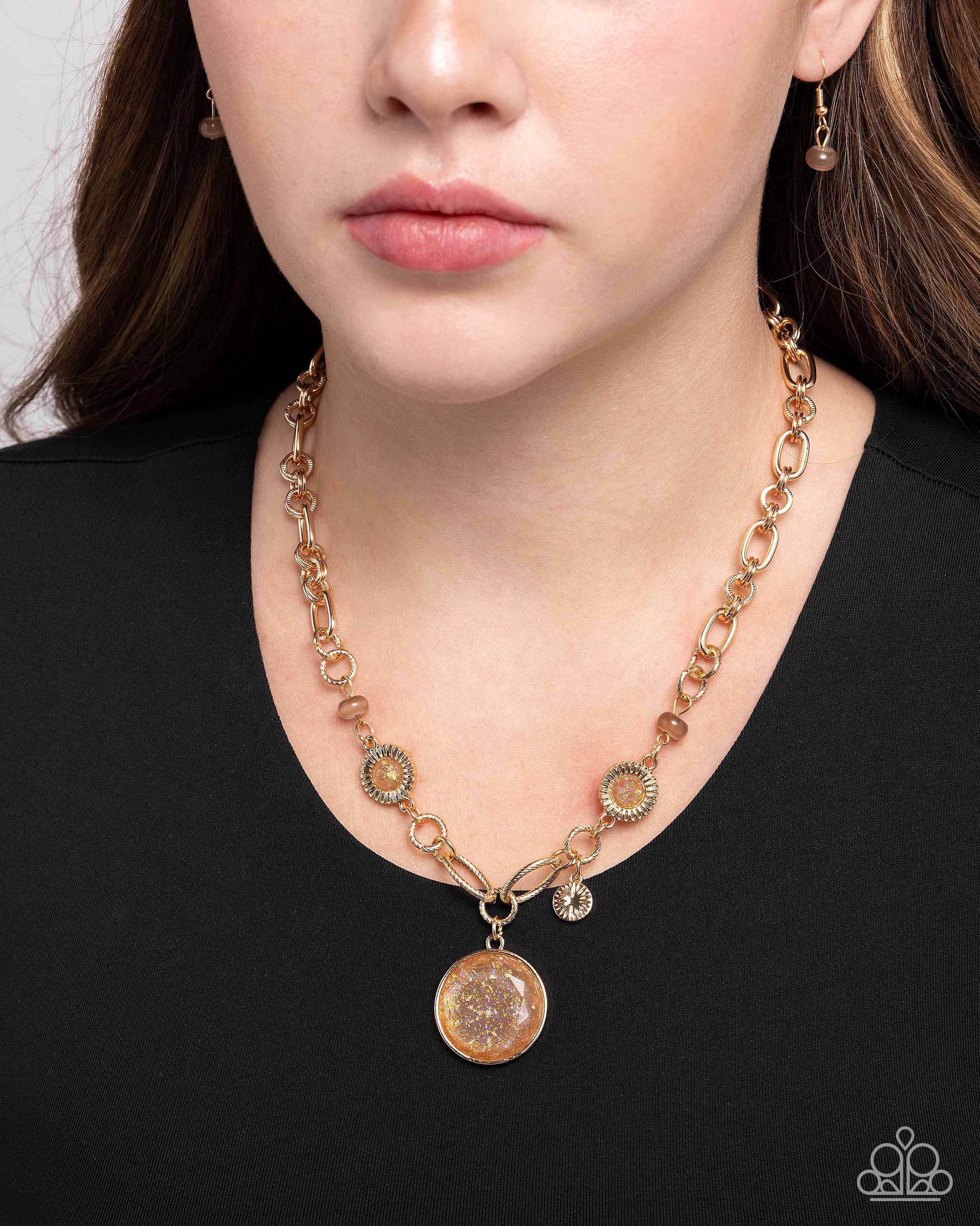 Interlocking below the neckline, textured gold links join elongated gold links, leading the eye to brown cat's eye beads, brown iridescent-flecked sunburst-textured pendants, coiled gold ovals, sunburst textured discs, and an oversized iridescent shell-flecked brown pendant for a dazzling, dimensional centerpiece. Features an adjustable clasp closure.