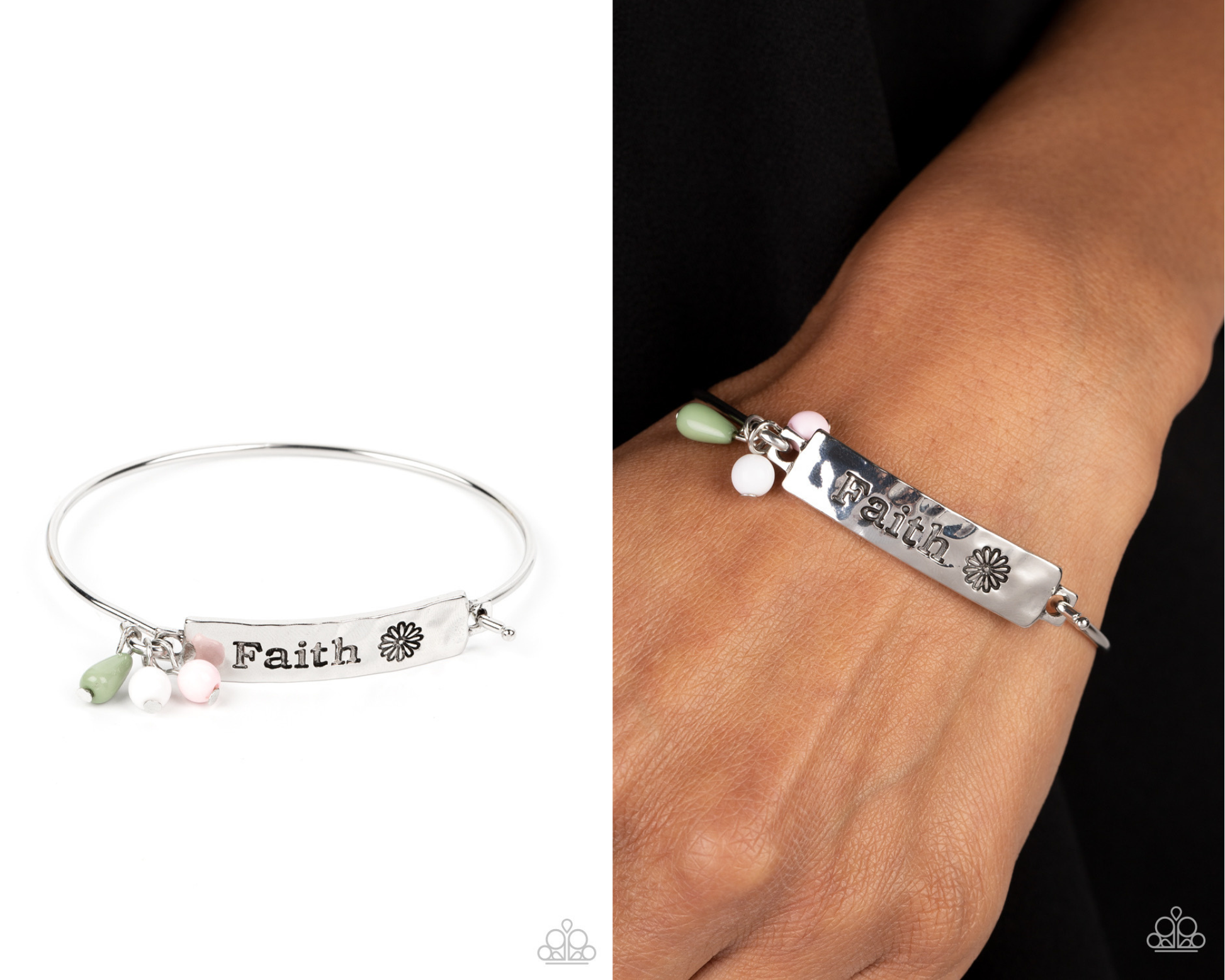 The word "Faith" and a whimsical daisy silhouette are stamped across a thick hammered plate of silver. Three acrylic beads in the shades of Loden Frost, white, and baby pink add a dash of color to this inspirational piece, gathering together where the plate attaches to a skinny silver cuff. Features a hook and eye closure.