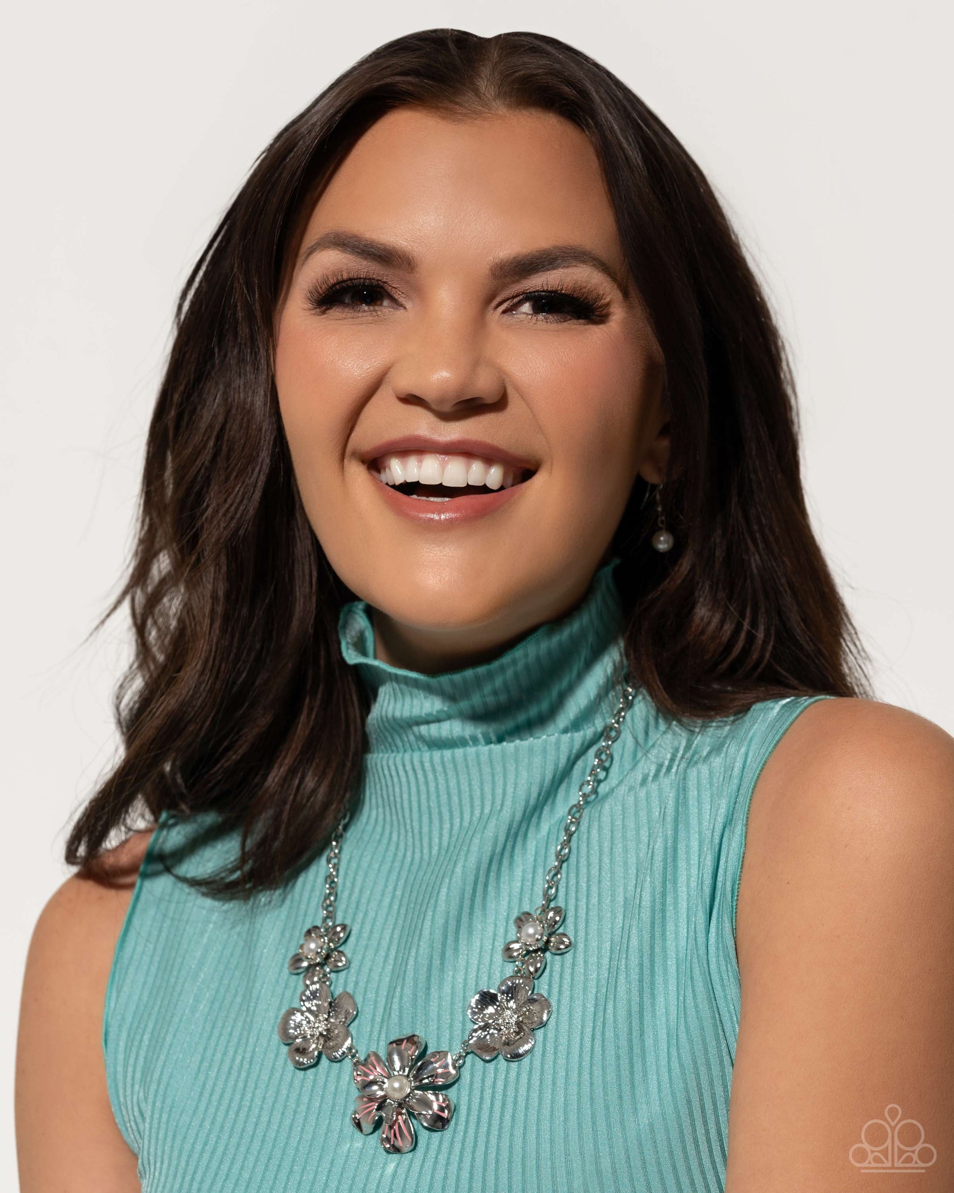 Featuring glassy white pearl centers, high-sheen silver-petaled flowers alternate with highly-serrated silver flowers below the collar for a fierce floral fashion. The larger pearl-centered silver flower featuring stripes of Burnt Coral adds a feminine finish to the design. Features an adjustable clasp closure.