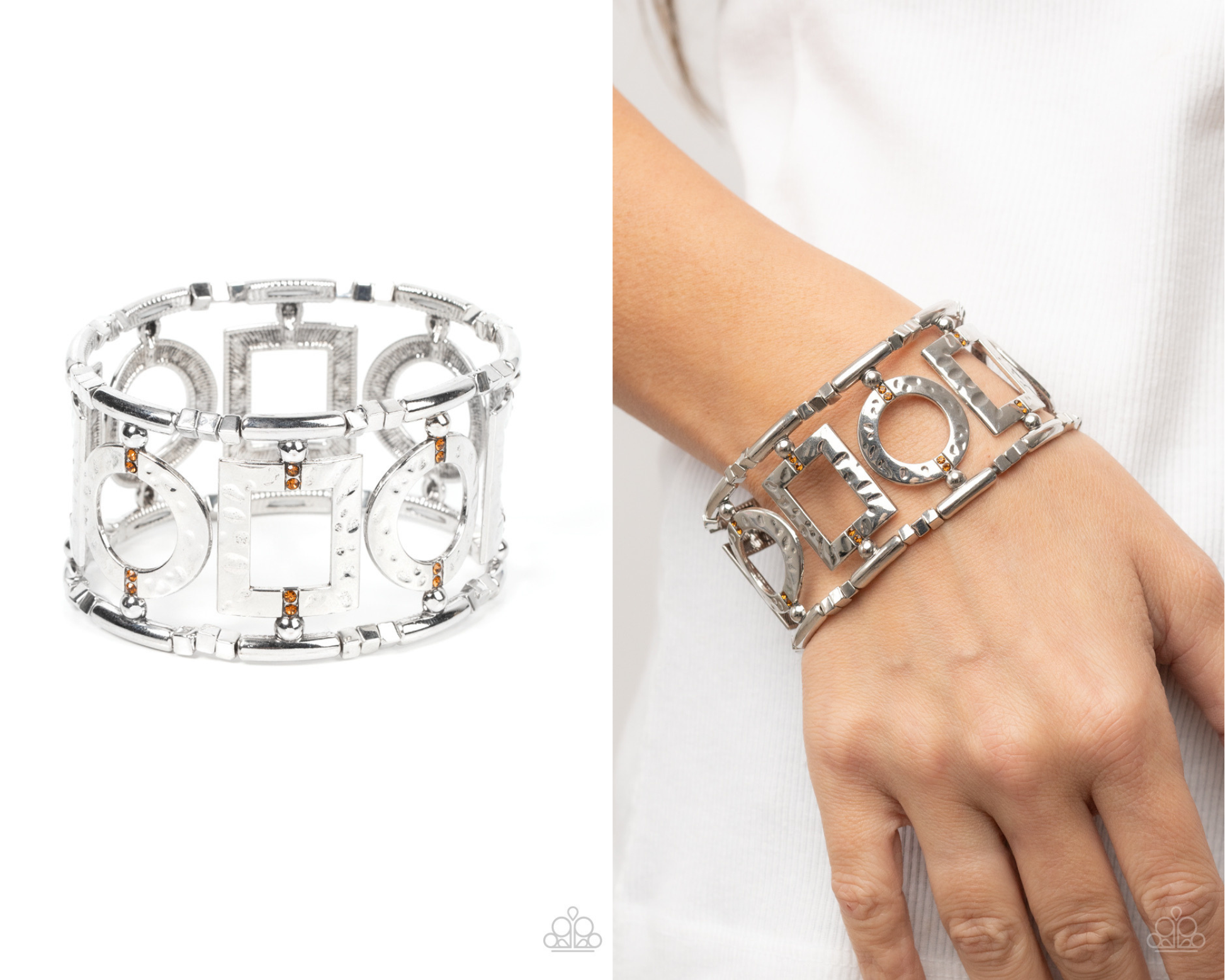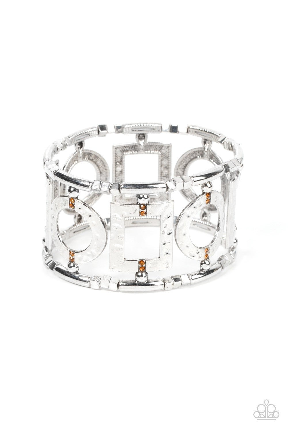 Dotted with dainty topaz rhinestones, an airy collection of hammered circular and rectangular frames glides along stretchy bands around the wrist. The geometric frames are separated by trios of dainty silver cube beads, adding extra edge to the textured display.