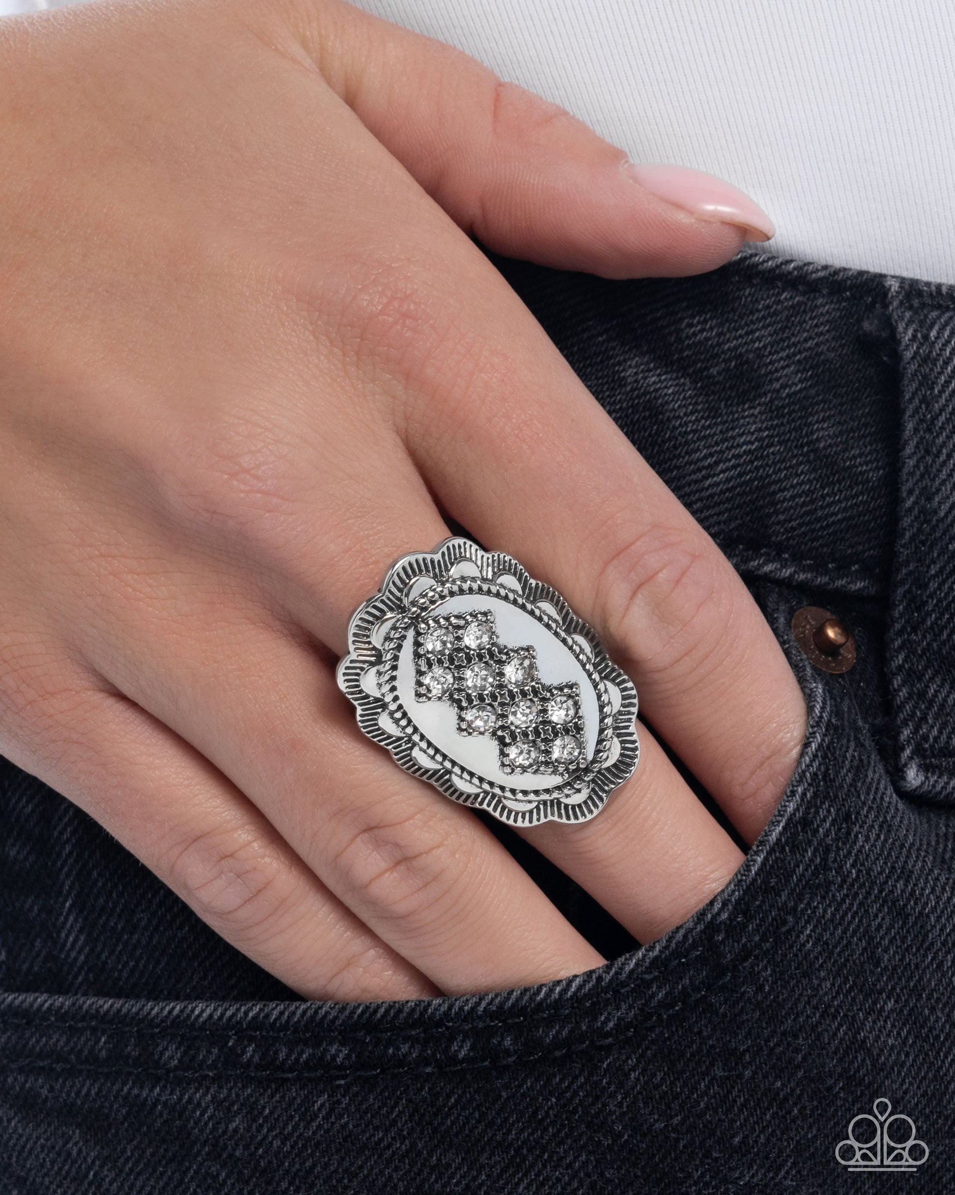 Set in the center of a scalloped and rope-textured oval silver frame, a collection of dainty white rhinestones shimmer amongst silver studs for a simply stunning centerpiece. Features a stretchy band for a flexible fit.