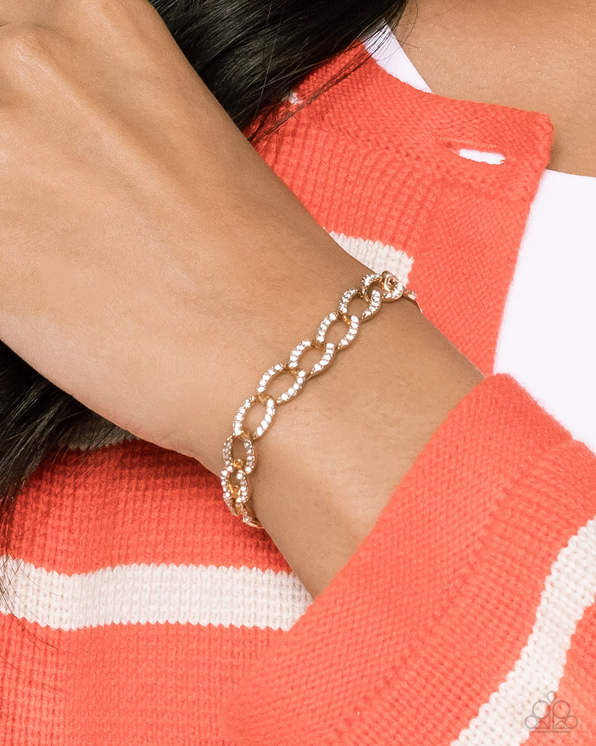Infused with glistening white rhinestones, a collection of gold curb chain links connect to a trio of monochromatic curb chain links for an industrial statement around the wrist. Features an adjustable clasp closure.