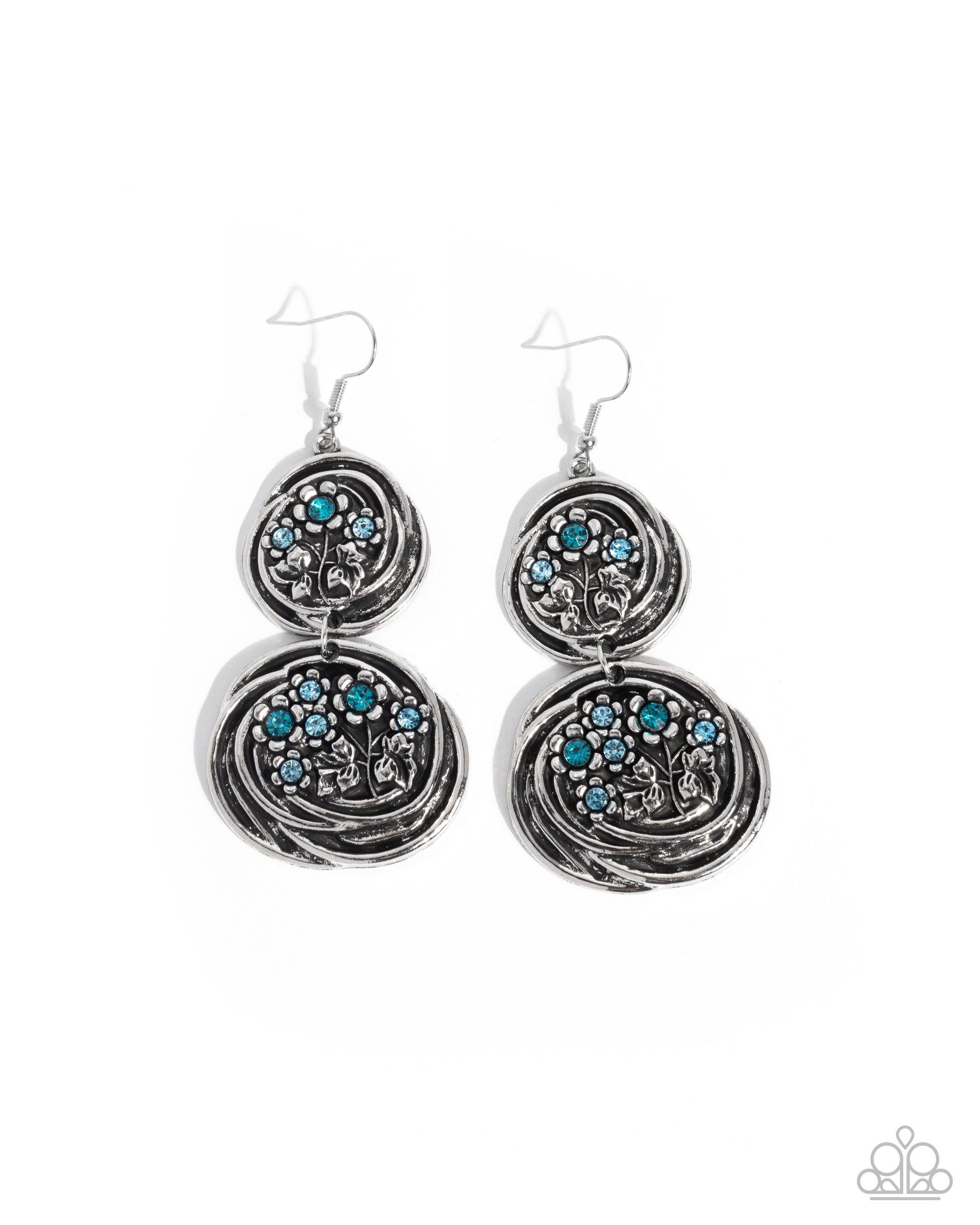 Sparkling aquamarine and blue zircon rhinestones are sprinkled along dainty silver bouquets, blooming atop swirl-textured mismatched silver discs radiating with whimsical leafy texture. Earring attaches to a standard fishhook fitting.