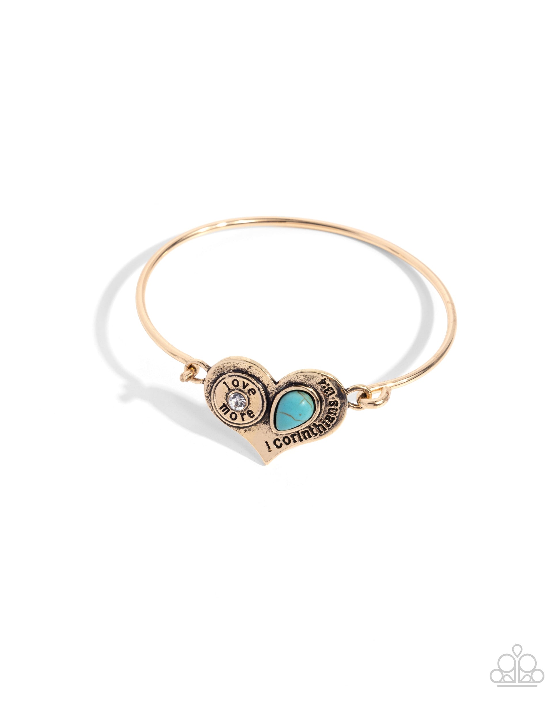 The phrases "Love More" and "1 Corinthians 13:4" are stamped across an antiqued gold heart beside and around a round white rhinestone and a teardrop turquoise stone, creating an inspirational, loving centerpiece as it's centered and hooked along a skinny gold bar that wraps around the wrist. Features a hook and eye closure. As the stone elements in this piece are natural, some color variation is normal.
