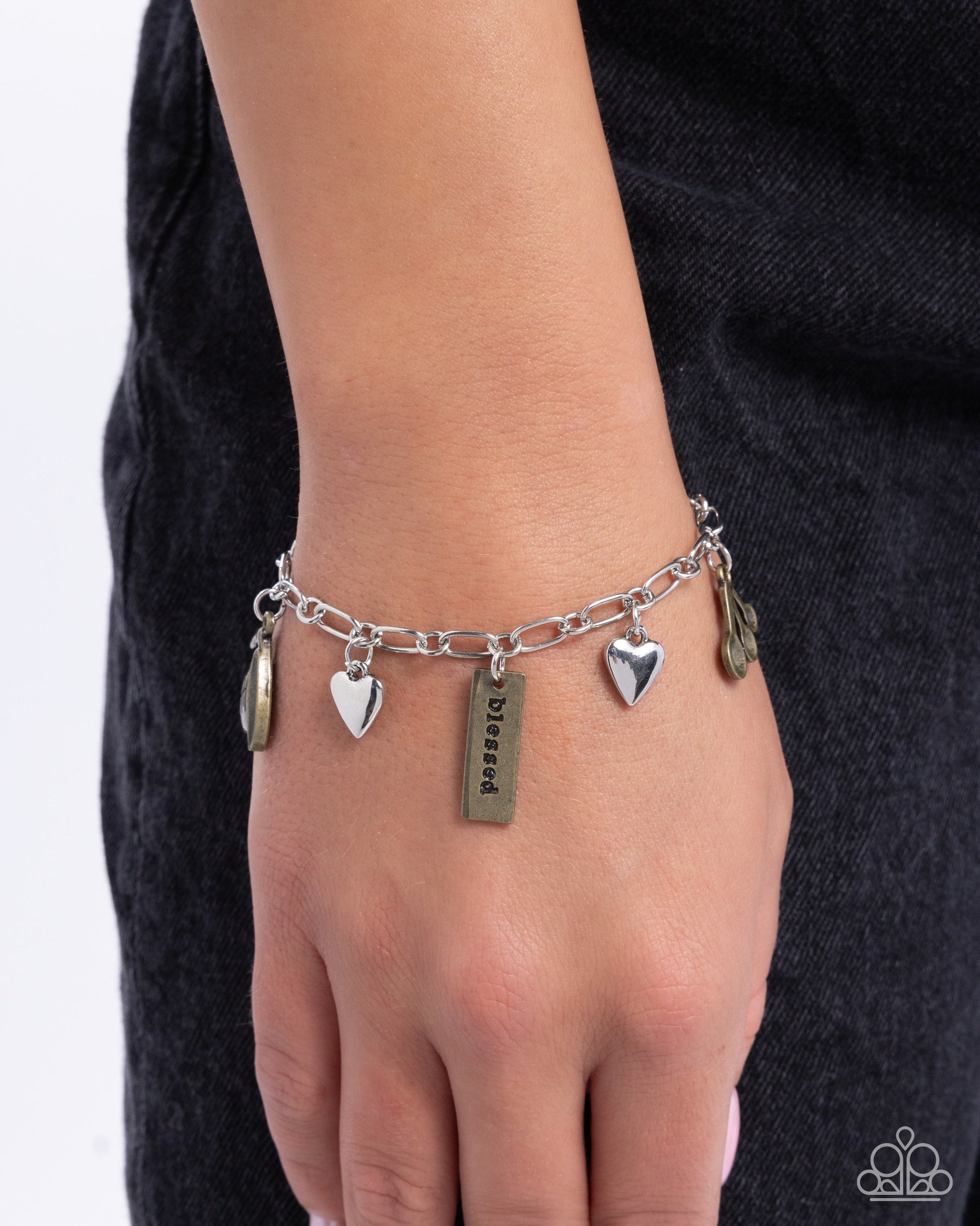 Modeled after the phrase "Glass Half Full" inspiring brass and silver charms including a brass measuring cup, brass measuring spoons, a vertical brass bar with the stamped word "blessed," and a duo of silver hearts sways along a silver paperclip chain along the wrist. Features an adjustable clasp closure.