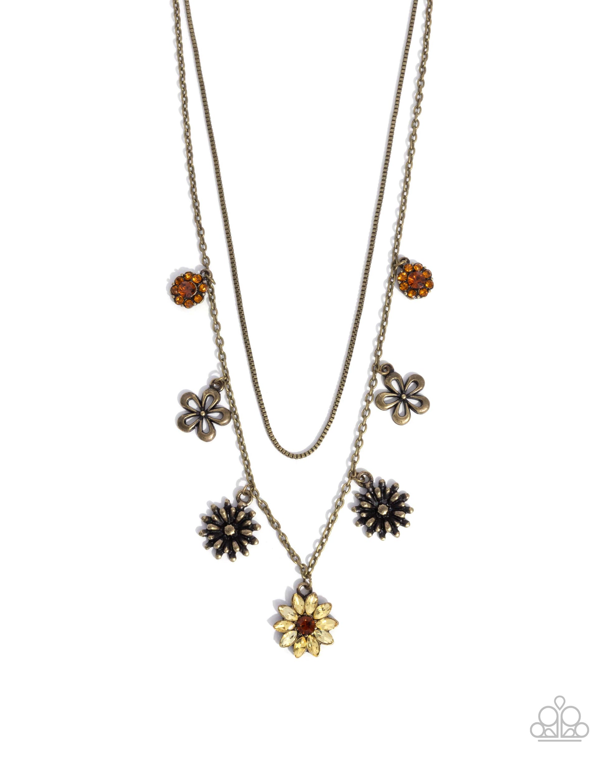Glinting Garden - Brass Rhinestone Flowers Necklace - Paparazzi Accessories
