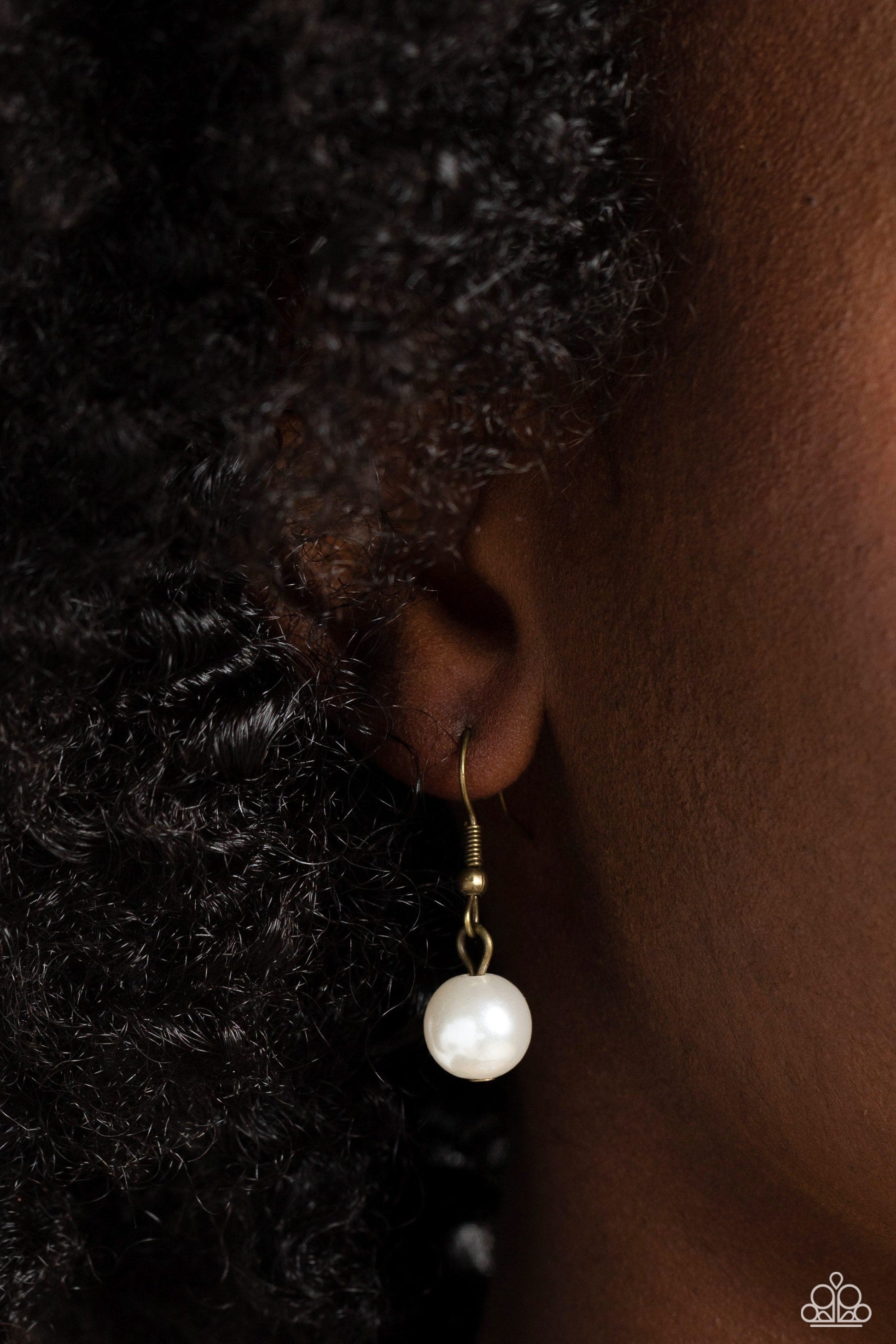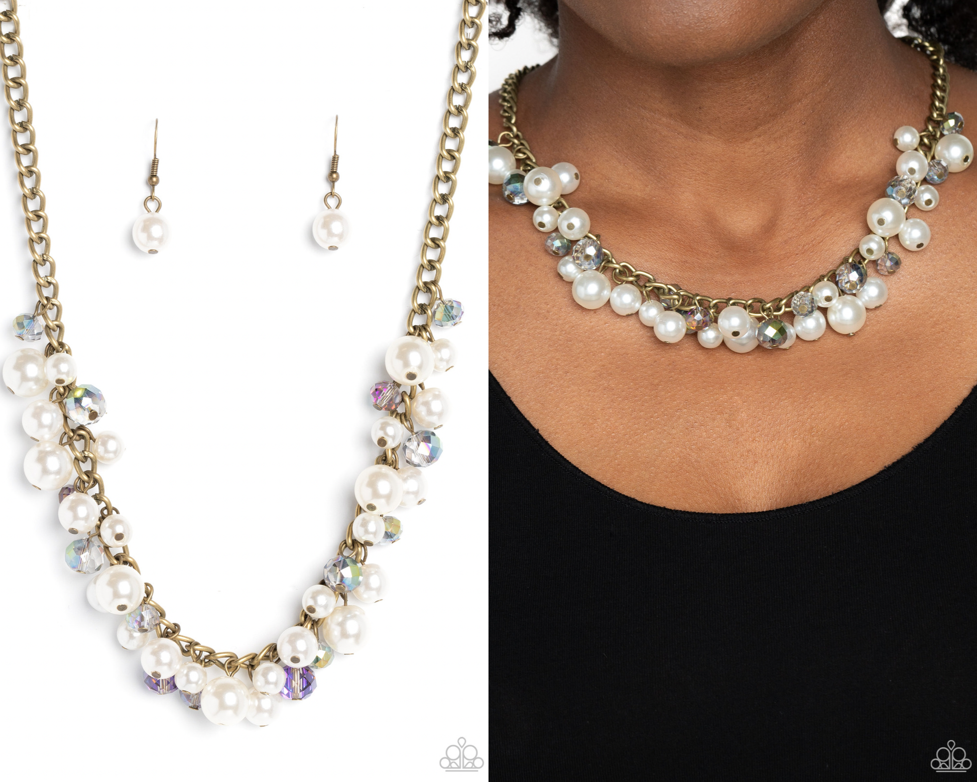 A faceted collection of glassy, UV reflective crystal-like beads and classic white pearls in varying sizes flickers and flashes below the collar on a thick brass curb chain for a refined shimmer. Features an adjustable clasp closure.