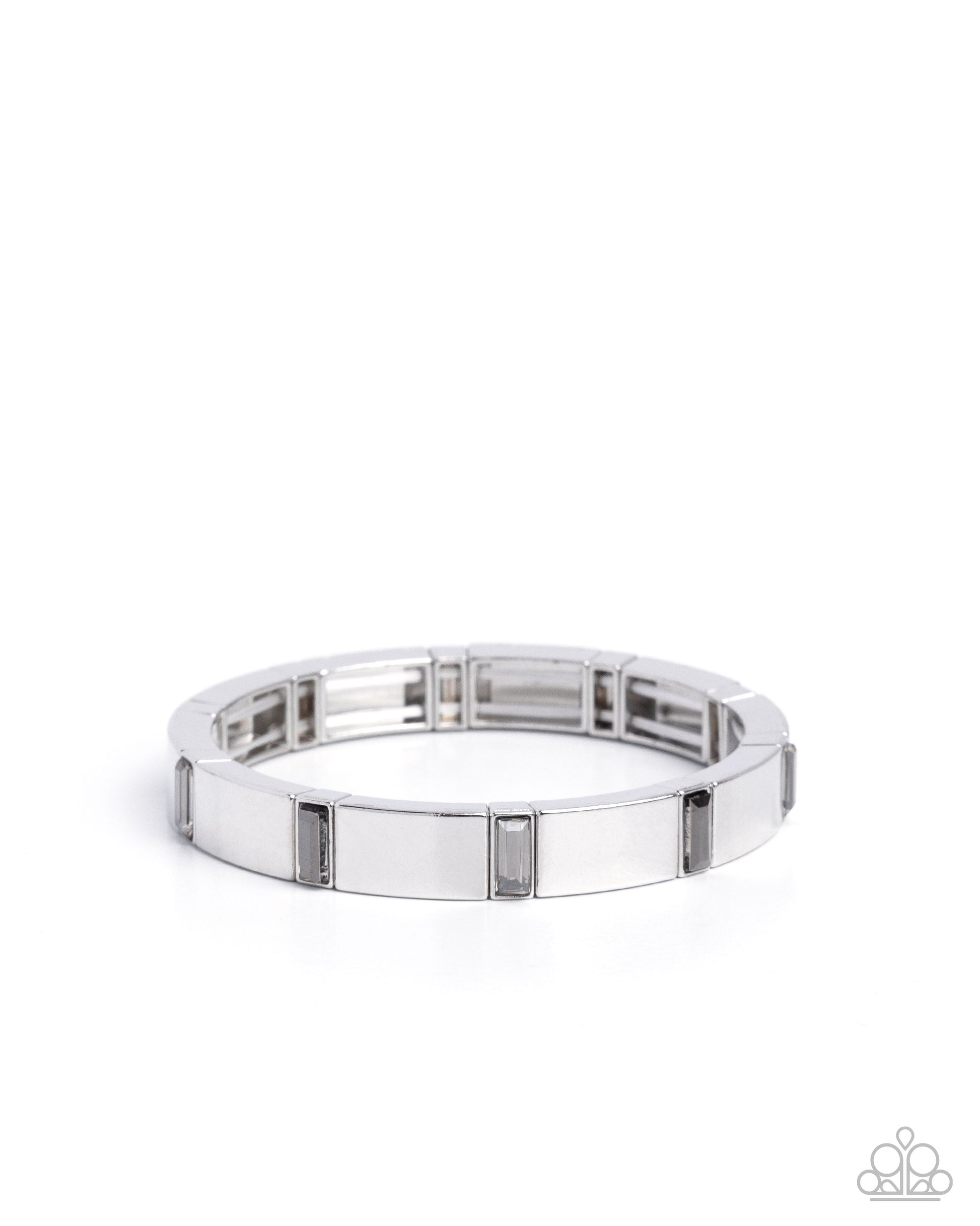 Infused along elastic stretchy bands, a collection of silver rectangular frames alternate with emerald-cut hematite and smoky gems in varying shades pressed in silver bars for a radiant flair atop the wrist.