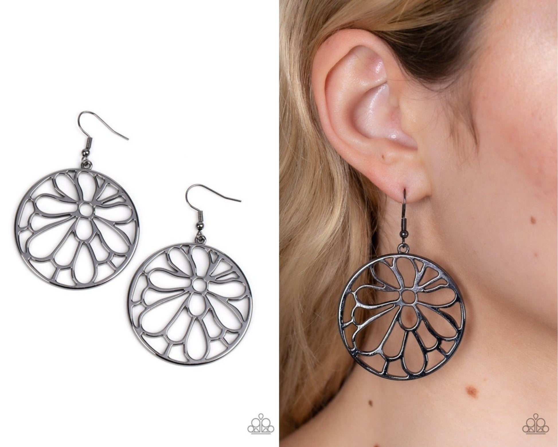 A stenciled gunmetal blossom asymmetrically blooms inside a gunmetal hoop, resulting in a whimsical floral fashion. Earring attaches to a standard fishhook fitting.