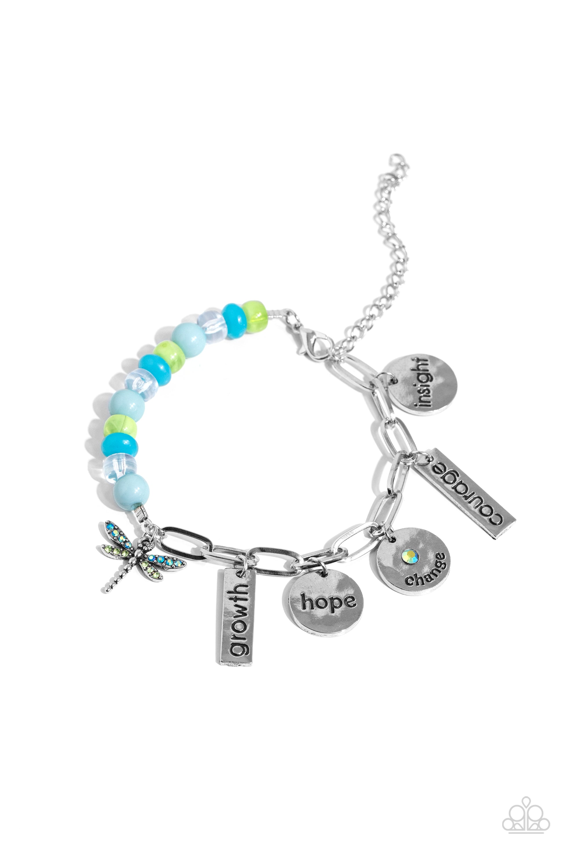 Vivacious Leek Green, turquoise, Skylight, and Waterspout beads in various opacities combine with a strand of silver paperclip links. Featuring the stamped words "growth," "hope," "change," "courage," and "insight," a motley of inspirational charms in circular and rectangular pendants dances alongside a blue and green rhinestone-encrusted dragonfly charm, connecting around the wrist for a hope-filled design. A solitaire blue iridescent gem is featured in the center of the "change" pendant for additional color. Features an adjustable clasp closure. Due to its prismatic palette, color may vary.