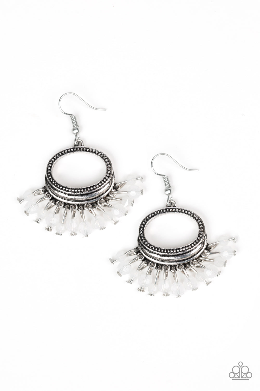 Opaque white crystal-like beads swing from the bottom of a studded round silver frame, creating a twinkling fringe. Earring attaches to a standard fishhook fitting.