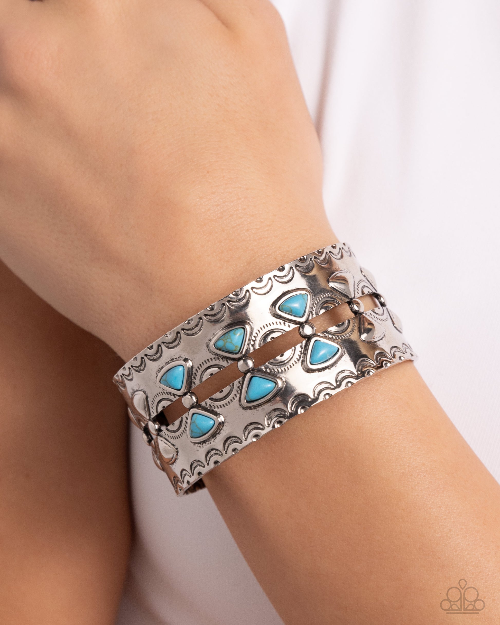The front of an antiqued silver cuff is embossed with various rustic details and triangular turquoise stones. The cuff is split into two with an airy middle that is welded in place with solitaire silver beads that form into a row, creating a gritty, natural look around the wrist. As the stone elements in this piece are natural, some color variation is normal.