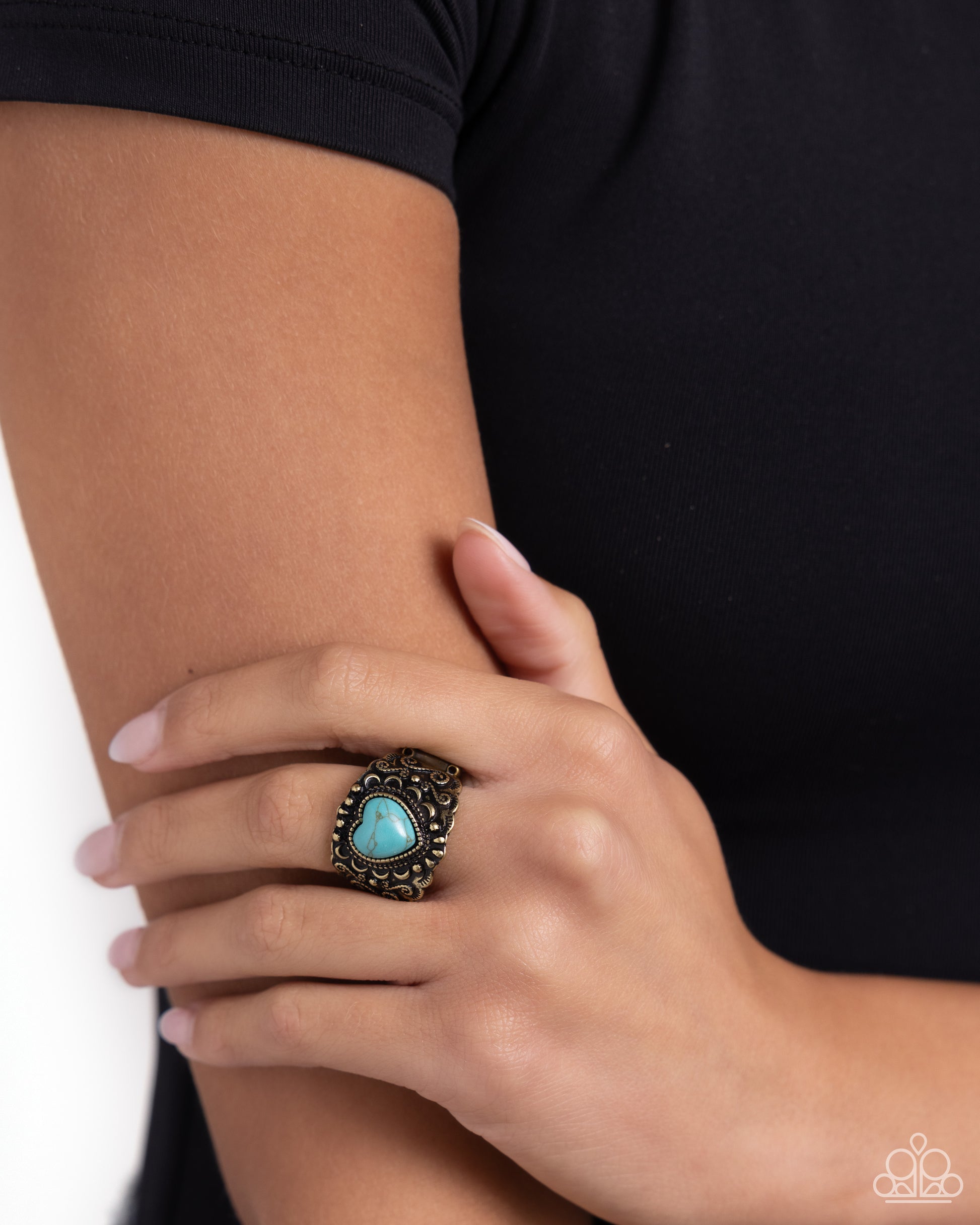 Set in the center of a swirling, highly-textured brass filigree centerpiece, a turquoise heart stone reflects light off its every surface atop the finger for a simply sweet statement. Features a stretchy band for a flexible fit. As the stone elements in this piece are natural, some color variation is normal.