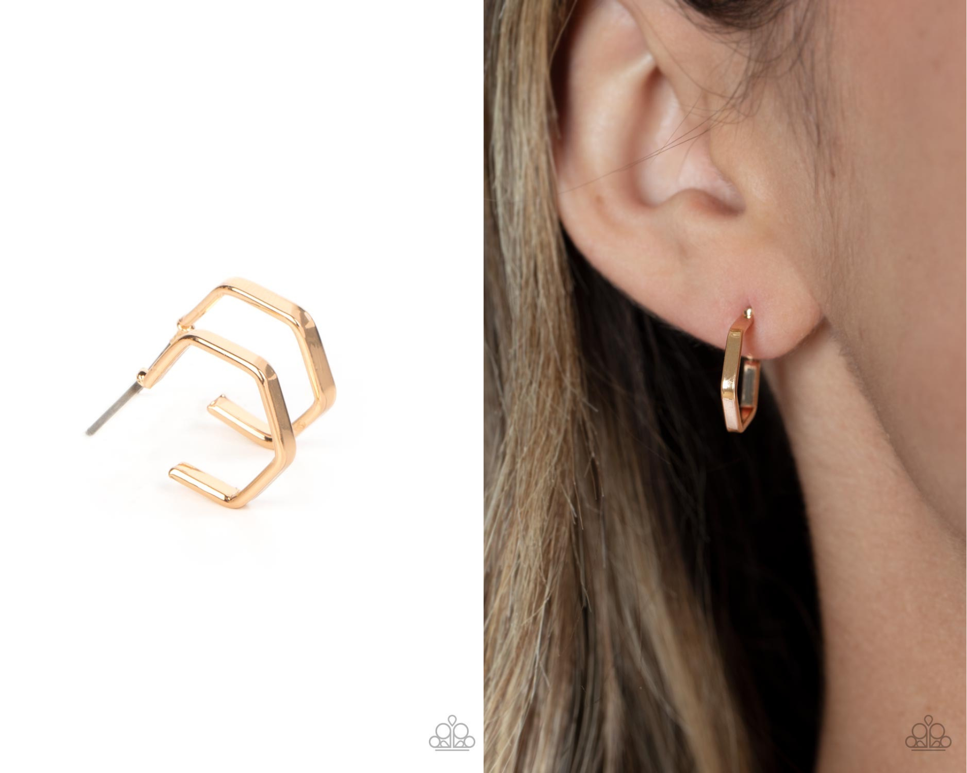 A deceptively simple hexagon frame is tilted on a point to create a geometric hoop around the ear. Its curved angles are complemented by its rich gold finish, making a lasting impression. Earring attaches to a standard post fitting. Hoop measures approximately 1/2" in diameter.