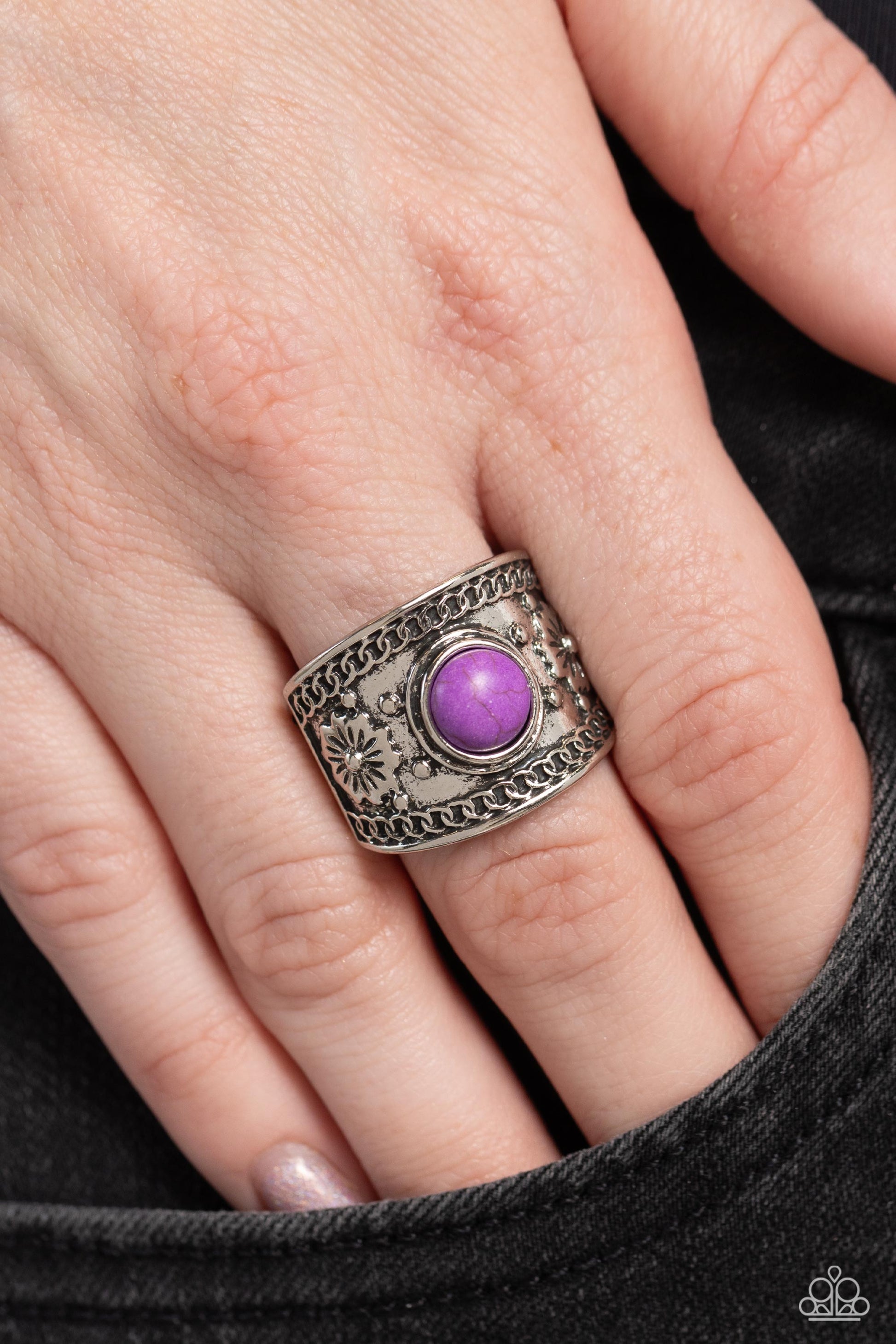 Bordered in chain-like details, a thick silver frame is adorned with a vivacious purple stone that is flanked by whimsical floral accents for a seasonal flair. Features a stretchy band for a flexible fit.