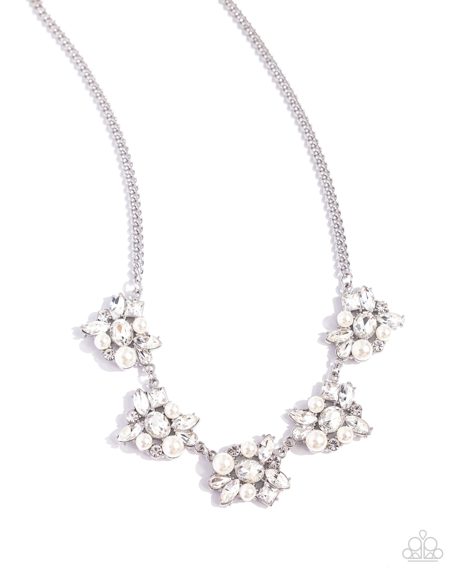 Bubbly white pearls and regally cut white rhinestones coalesce into blinding frames that glamorously link below the collar, creating a timeless fringe. Features an adjustable clasp closure.