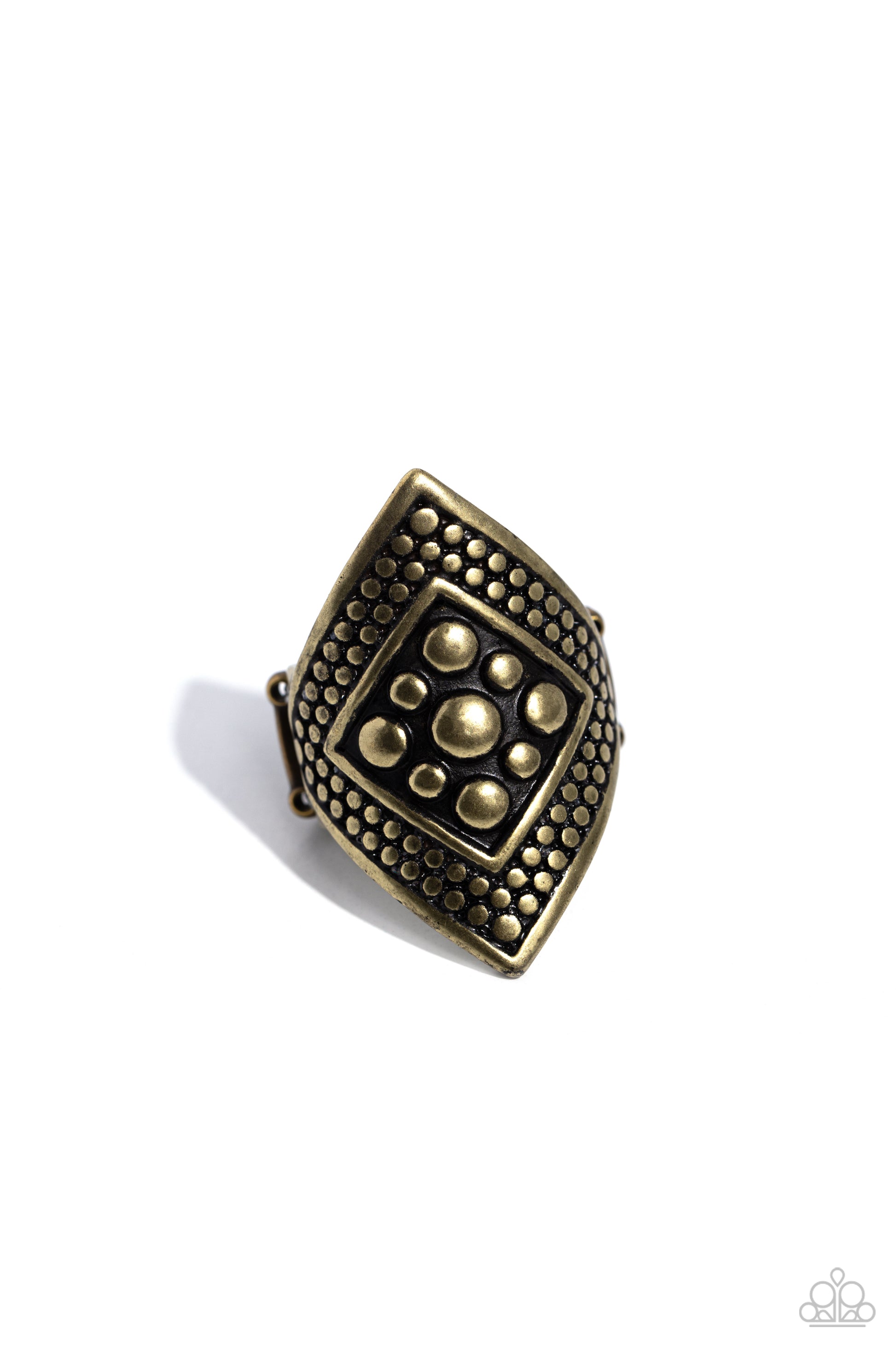 Rows of dainty, tactile brass studs radiate across the finger on an elongated diamond frame for a downright earthy finish. Features a stretchy band for a flexible fit.
