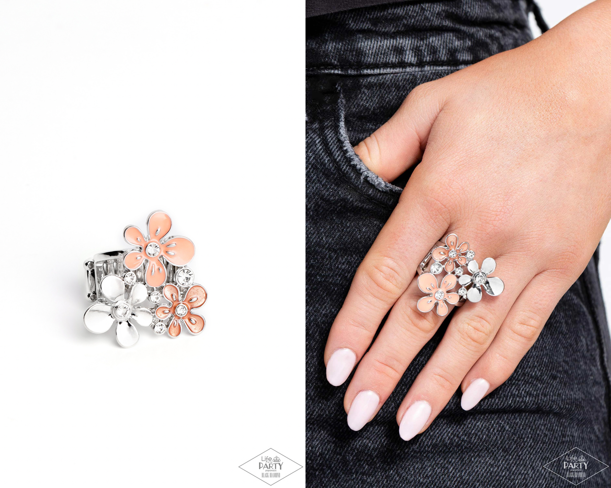 Two flowers in complementary shades of coral are paired with a silver flower in a sleek finish. Each flower is dotted with brilliant white rhinestones for flawless light-catching detail. Features a stretchy band for a flexible fit.