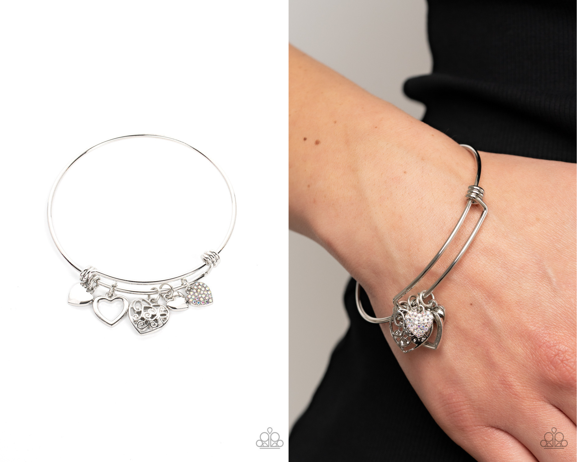 Featuring shiny silver, iridescent rhinestones, and filigree-filled finishes, a mismatched collection of dainty heart charms glides along a silver bar fitting at the center of the wrist for a romantic flair.