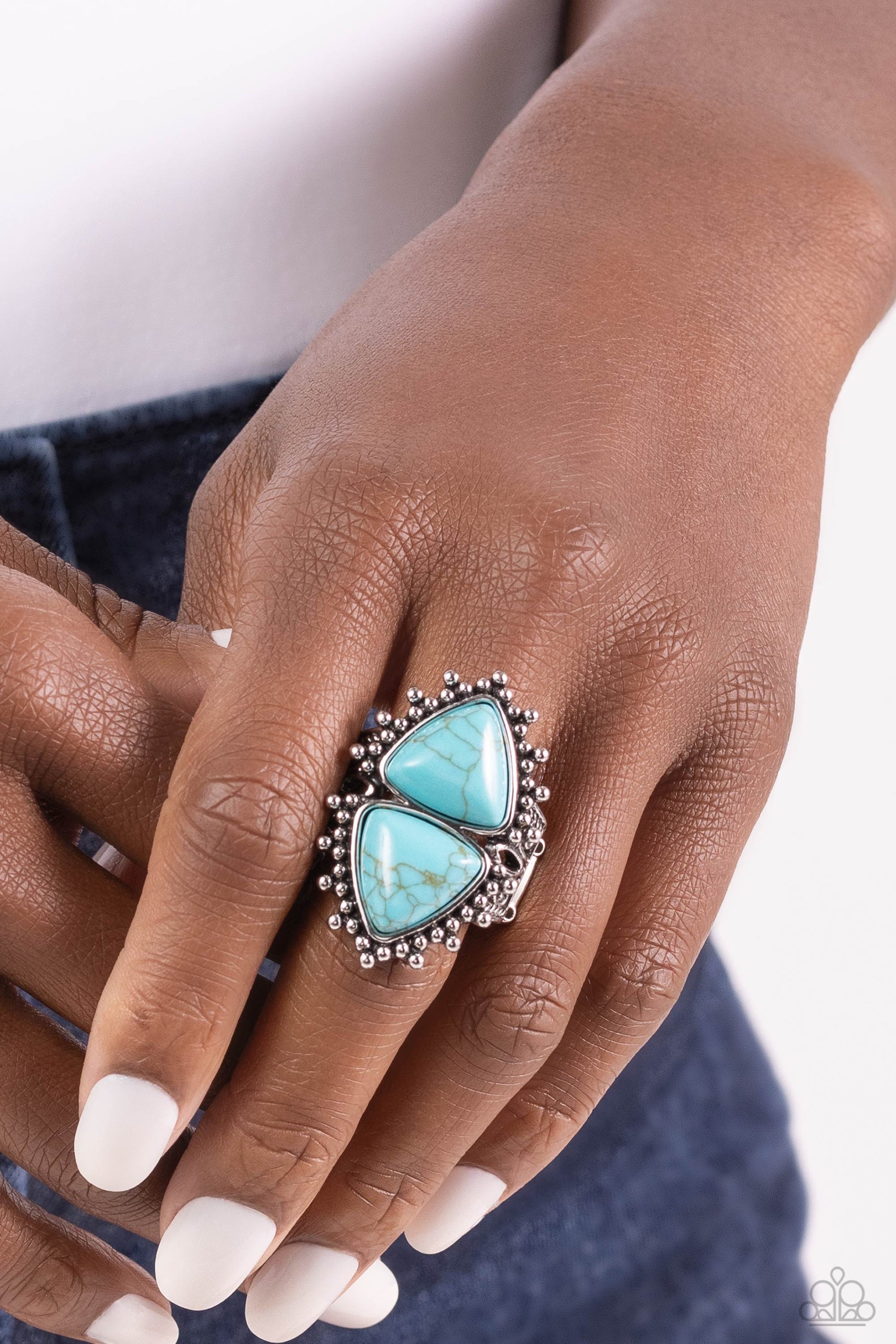 Nestled inside a silver frame embellished with tactile silver studs, turquoise triangular stones stack atop one another in an inverted pattern, creating a geometrically earthy centerpiece. Swirls of silver filigree are etched along the airy band of the ring for additional artisanal detail. Features a stretchy band for a flexible fit. As the stone elements in this piece are natural, some color variation is normal.