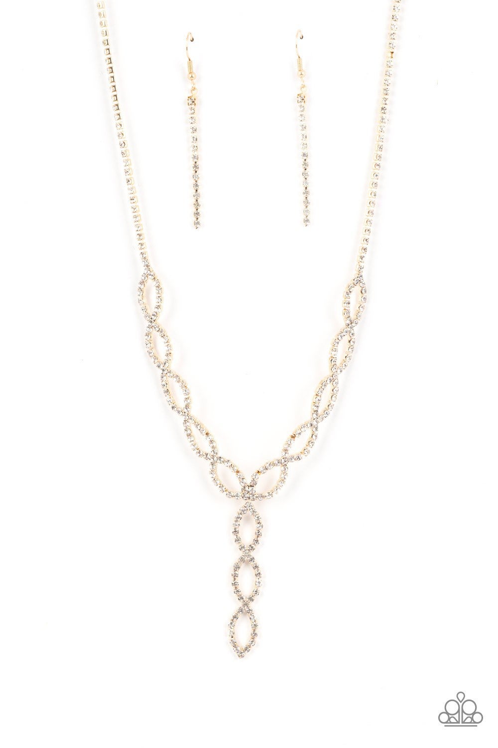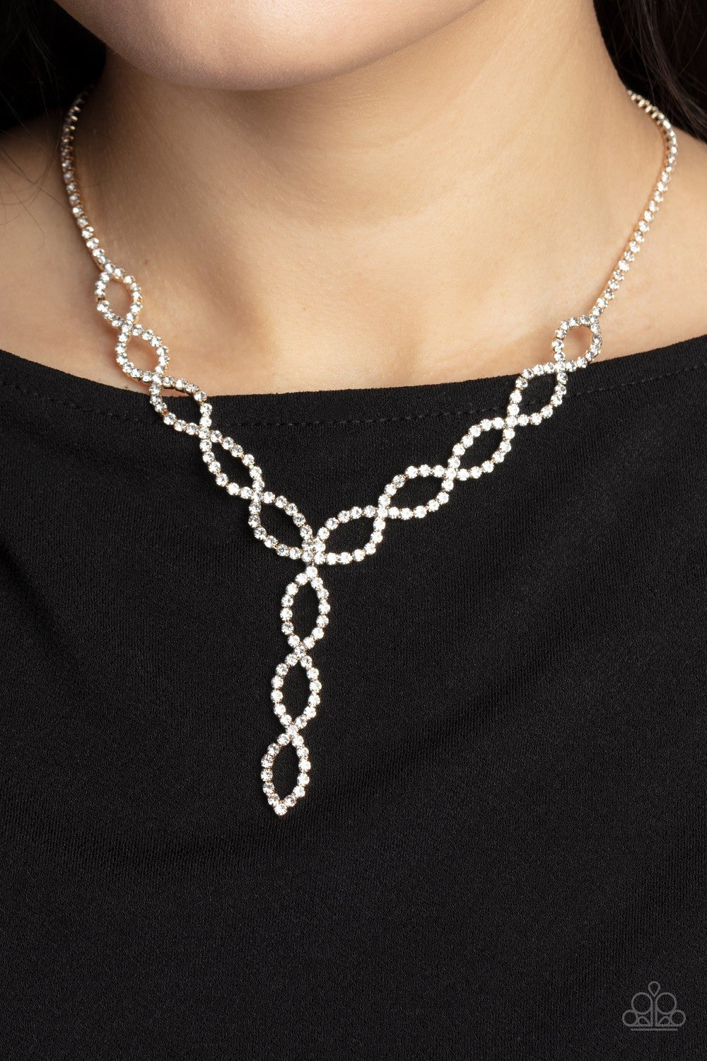 Golden strands of glassy white rhinestones delicately loop into interlocking infinities below the collar, drizzling into an icy extended pendant for a statement-making finish. Features an adjustable clasp closure.