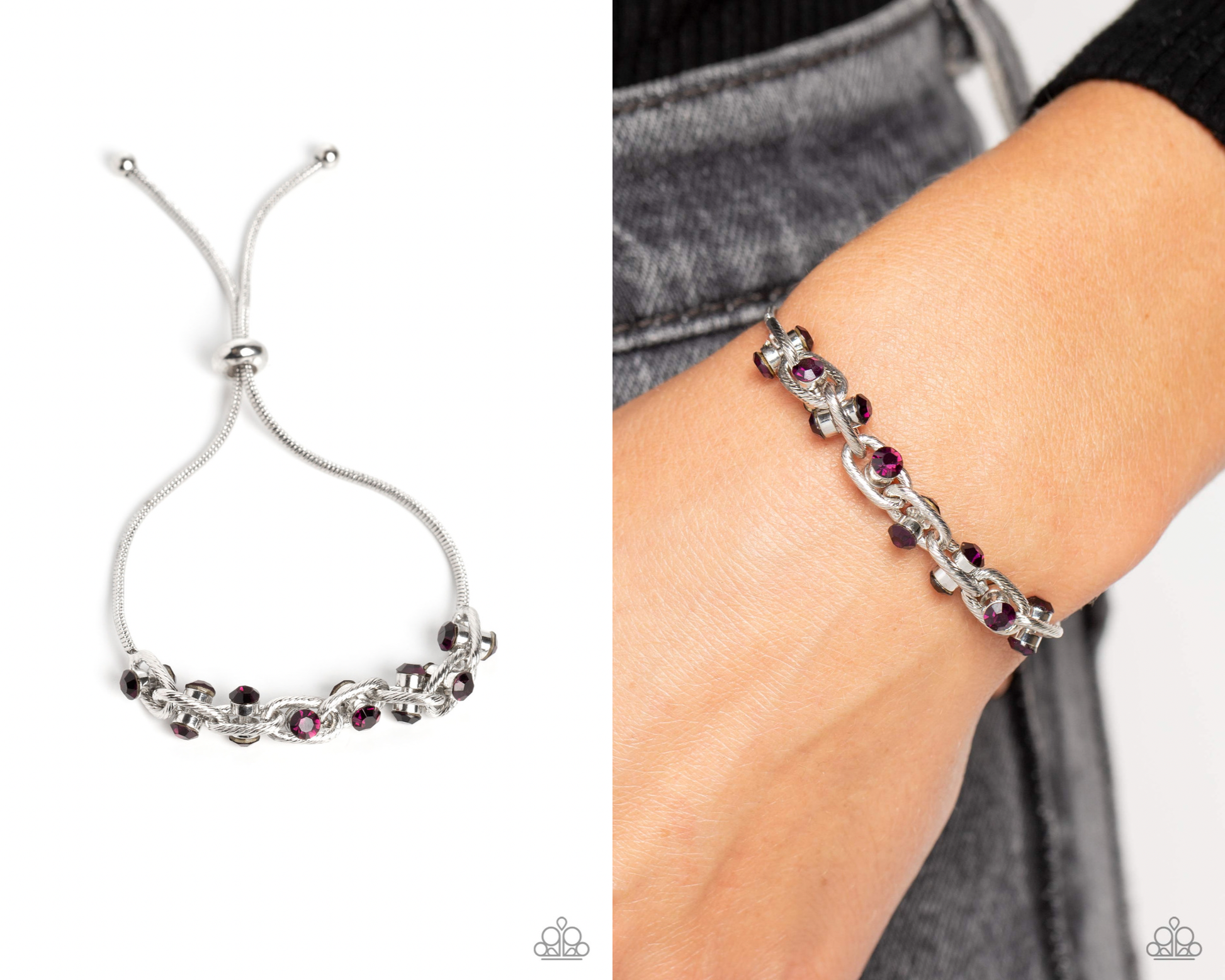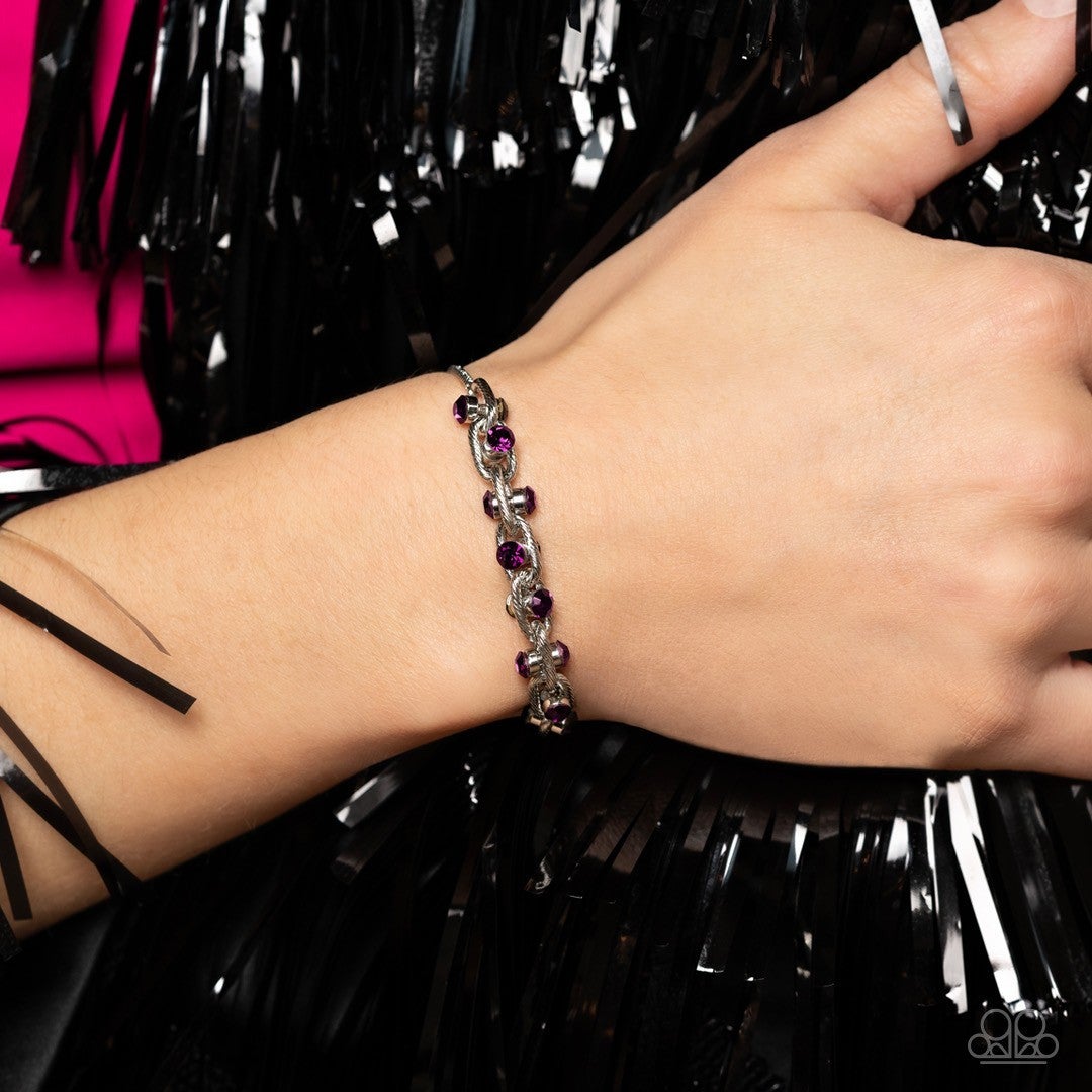 Silver oval links lined with texture interlock around one another at the end of a silver snake chain. Featured in the center of each link, a double-sided pendant with dainty amethyst rhinestones glimmers for a subtle pop of color around the wrist. Features an adjustable sliding knot closure.