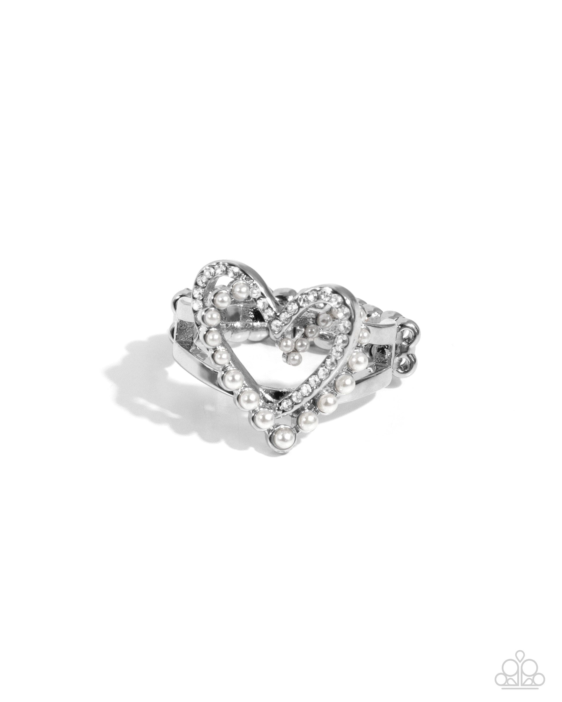 Featuring glossy white pearls and glittery white rhinestones, two silver hearts interlock and flair atop the finger between airy silver bands for a timelessly twisted look. Features a dainty stretchy band for a flexible fit.