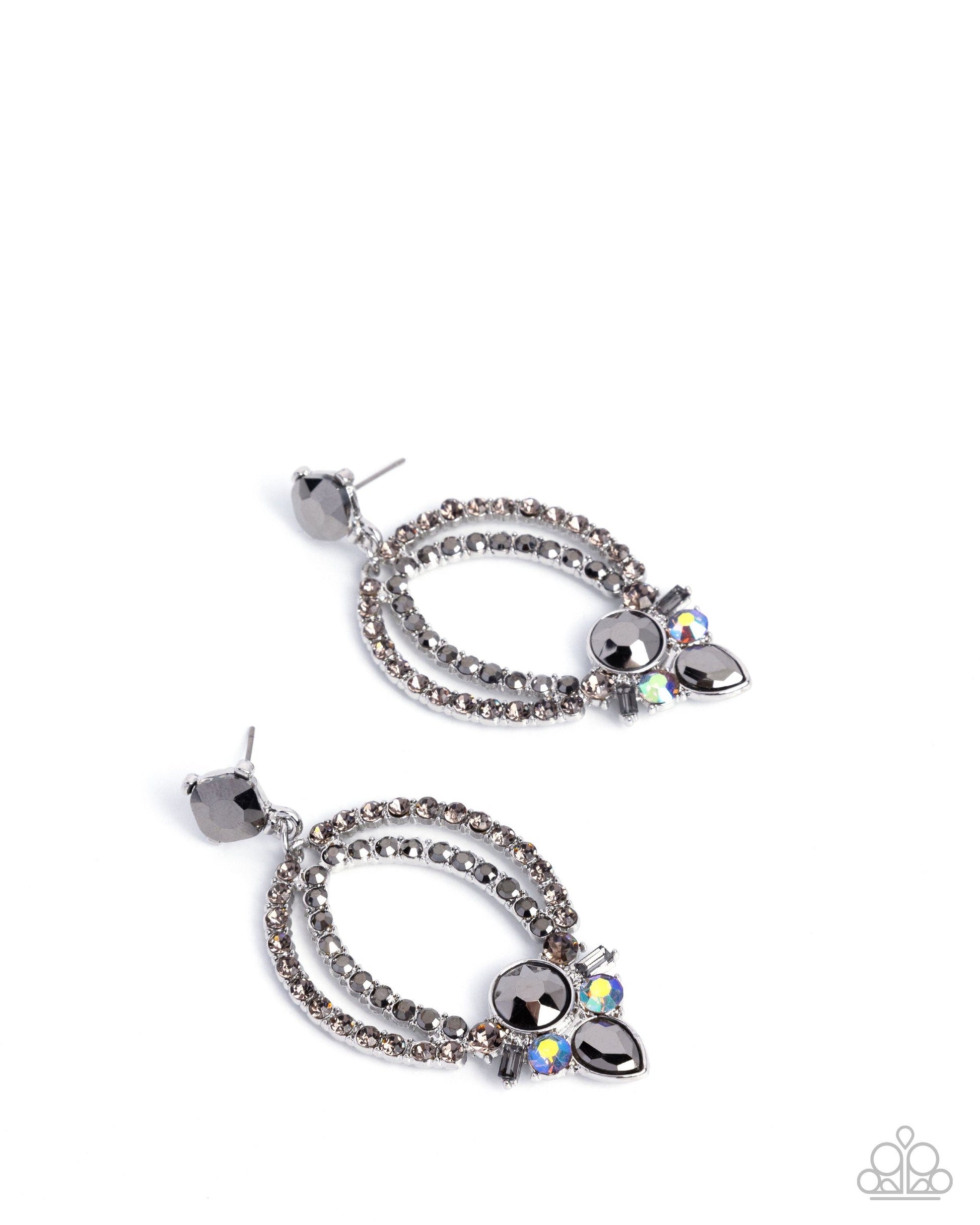 Pressed in silver-pronged fittings, a rounded square hematite gem gives way to dainty smoky and hematite rhinestones that arch out in half-oval layered fittings, drawing the eye to its lower cluster of multicolored and iridescent hematite and smoky gems and rhinestones in varying cuts for a dynamic display of color. Earring attaches to a standard post fitting. Due to its prismatic palette, color may vary.