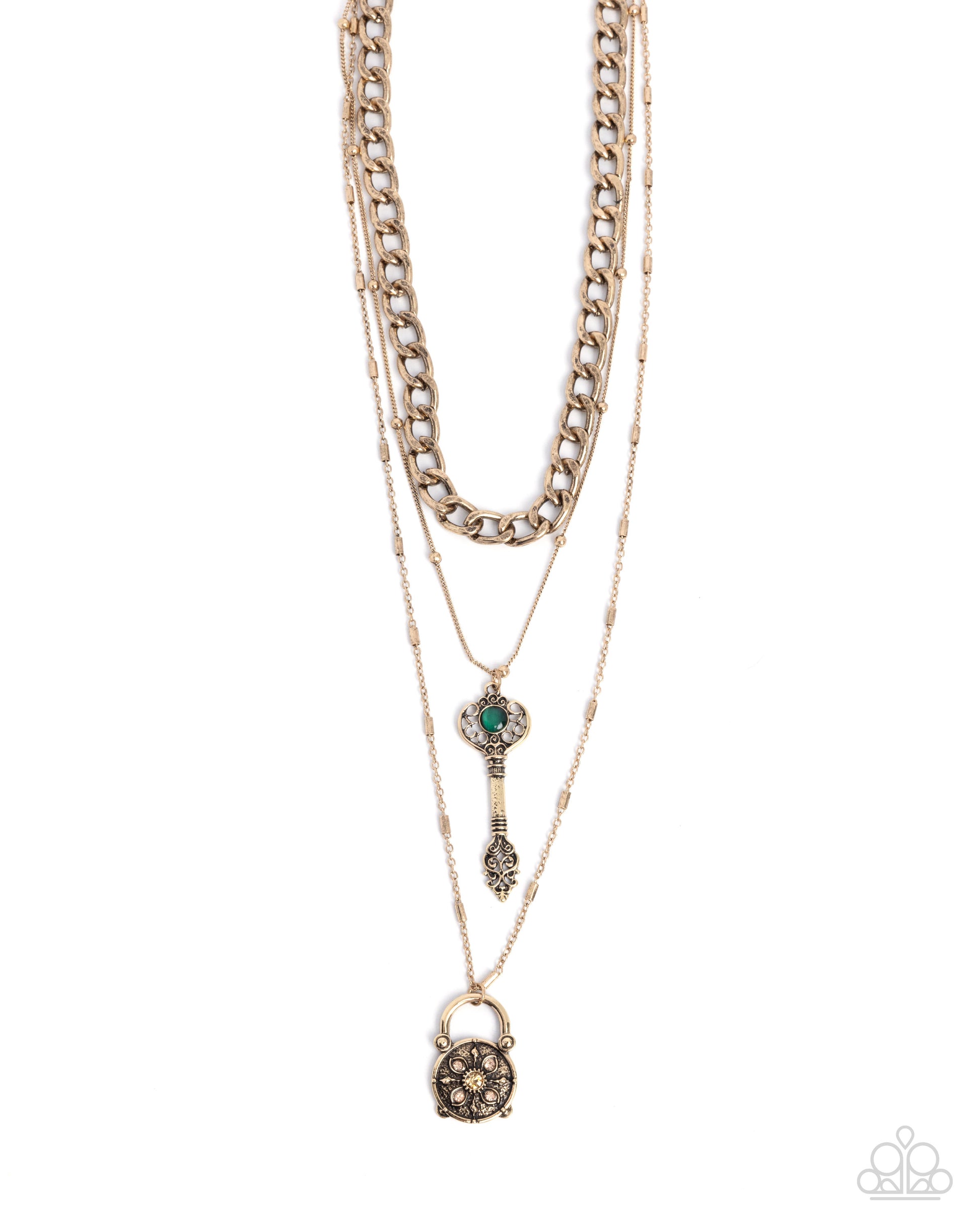 Three mismatched strands of curb, dainty satellite, and classic cylindrical-infused antiqued gold chains fall into tiered layers as they cascade down the chest. An emerald cat's eye stone-dotted filigree gold key and a light peach and light-colored topaz rhinestone-dotted patterned gold padlock charm slide along the lowermost chains for a dizzying, art deco-inspired display. Features an adjustable clasp closure.