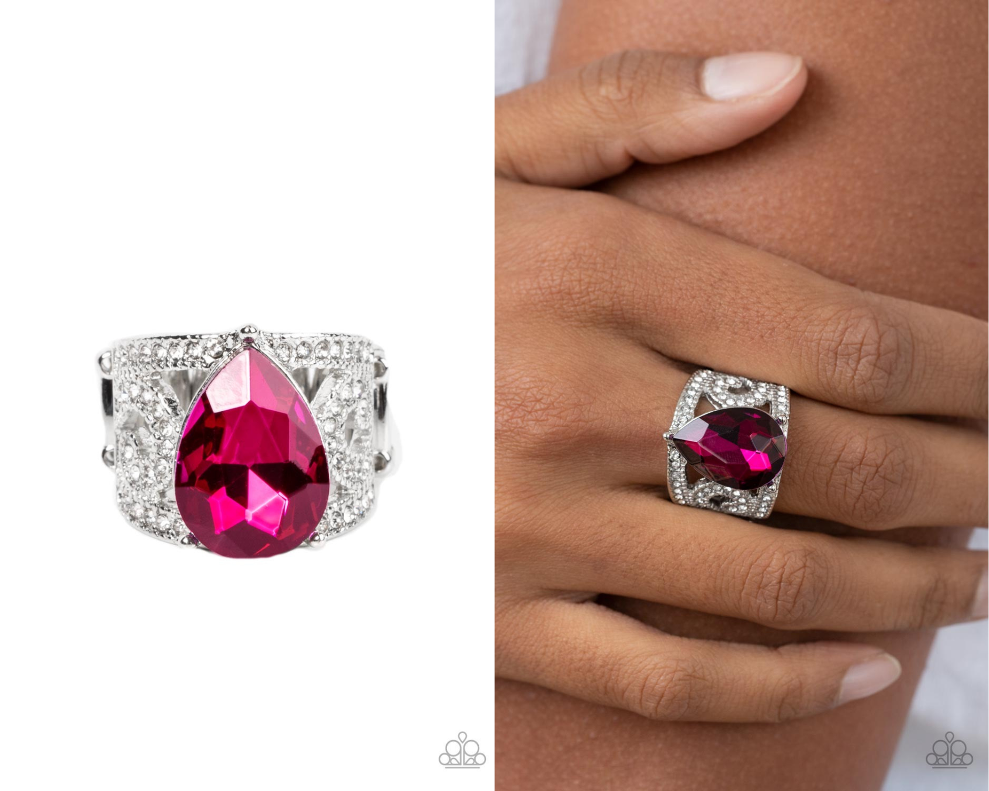 An oversized pink teardrop gem embellishes the center of a regal filigree filled band dotted in glassy white rhinestones, invoking a royal radiance atop the finger. Features a stretchy band for a flexible fit.