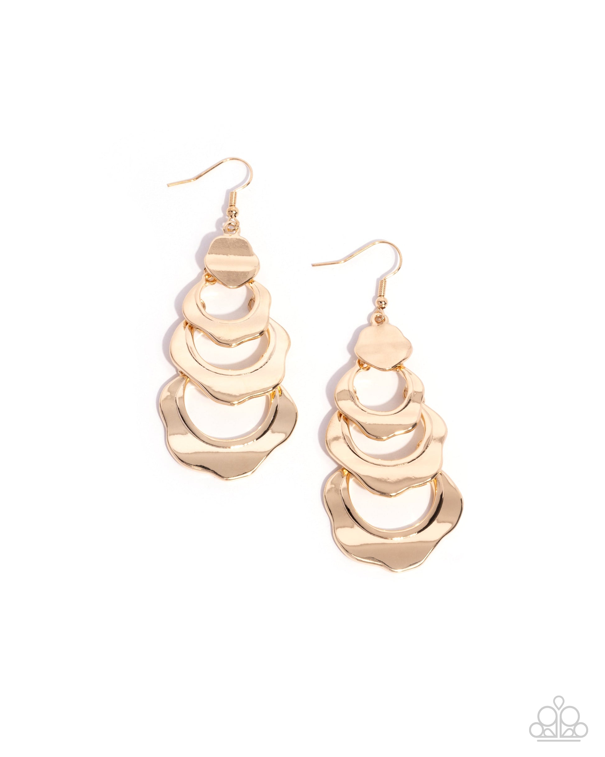 A trio of three warped gold hoops gradually increases in size and gives way from a warped gold disc for a light-catching layered look. Earring attaches to a standard fishhook fitting.