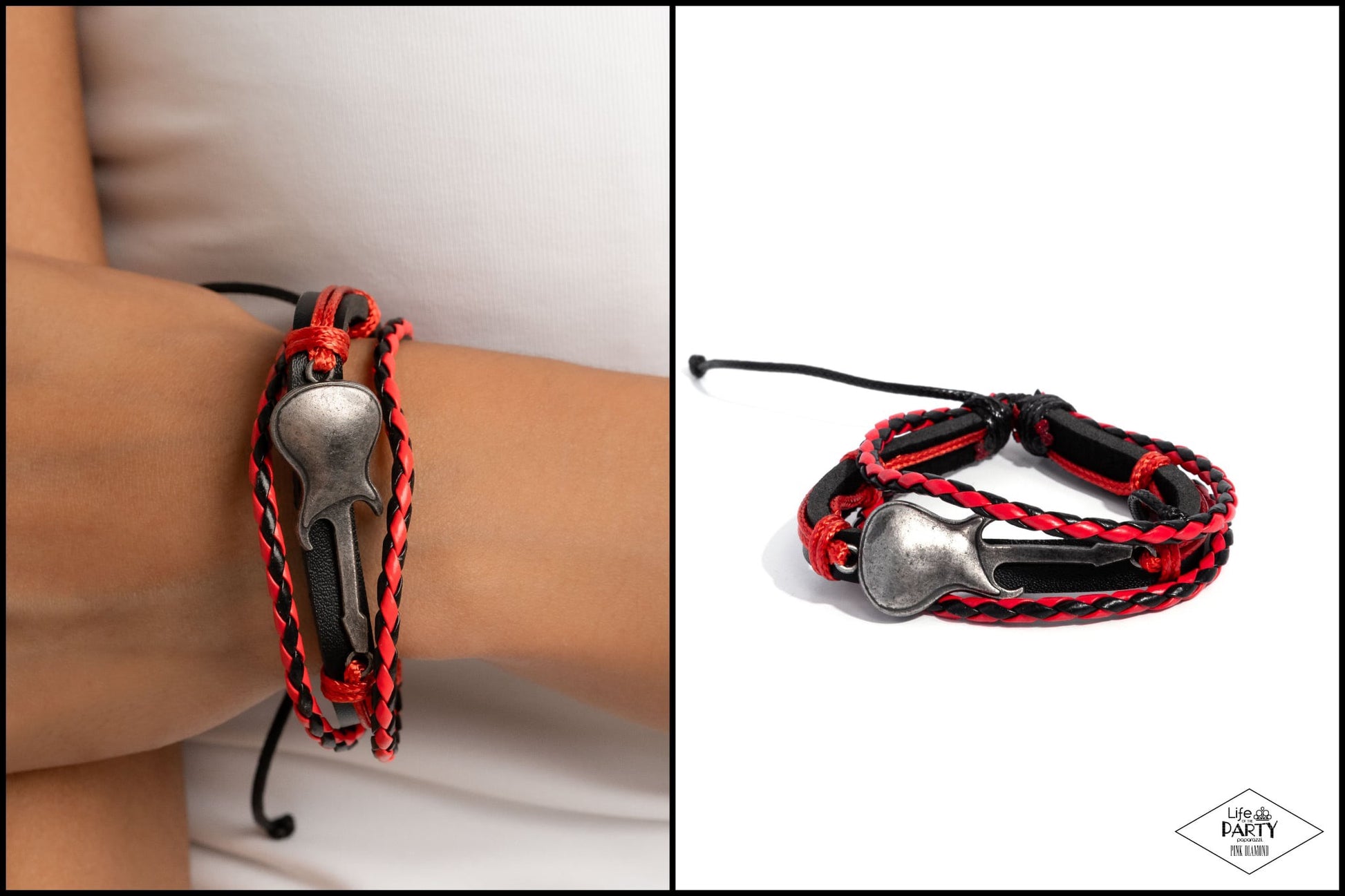 Lead Guitar - Red & Black Leather Silver Guitar Sliding Knot Closure Bracelet - Pink Diamond Exclusive - Paparazzi Accessories