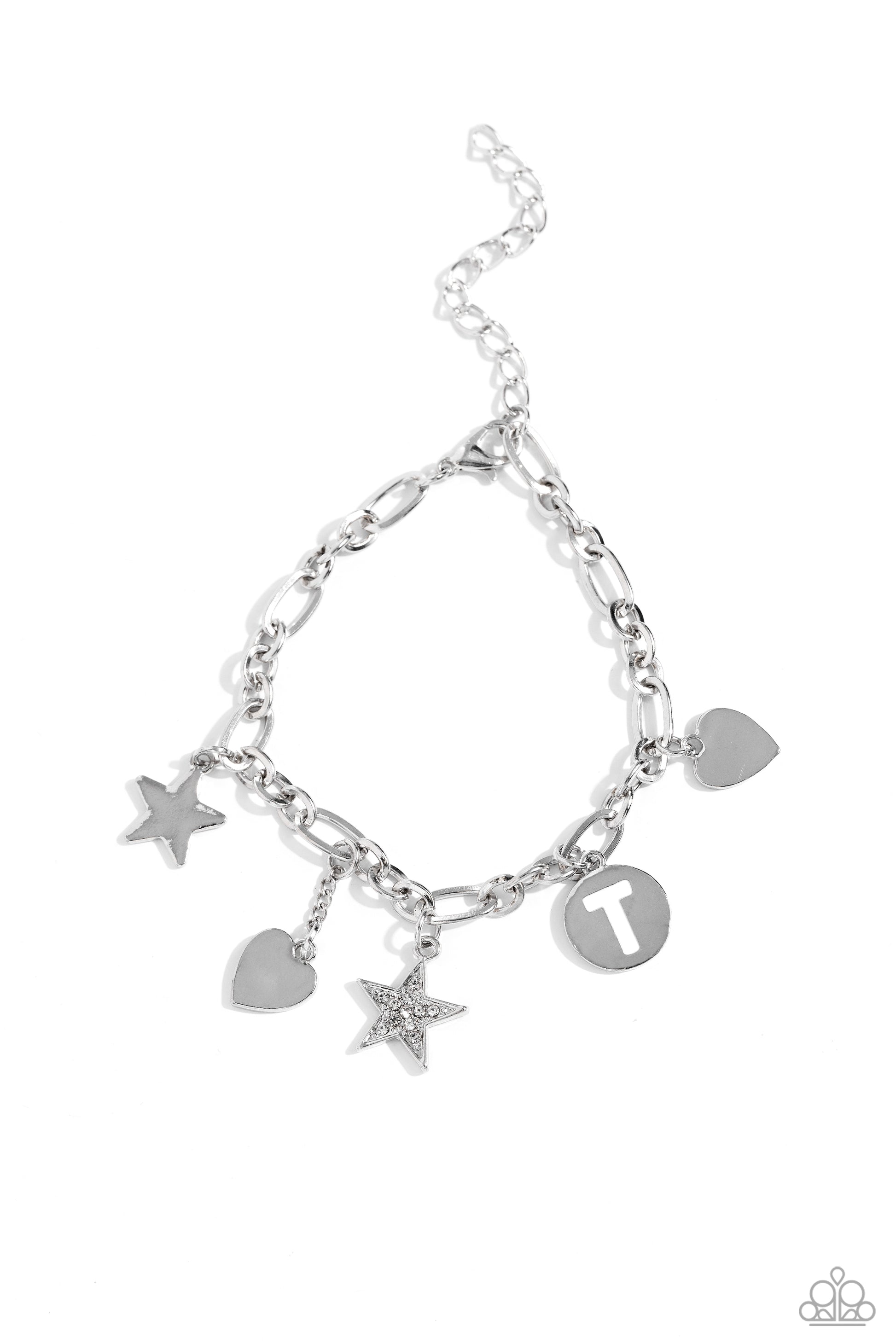 A strand of silver chain is decorated with sentimental charms, including a white rhinestone-encrusted and sleek silver star, a hammered and sleek silver heart, and a white-painted "T" silver pendant for a charismatic display around the wrist. Features an adjustable clasp closure.
