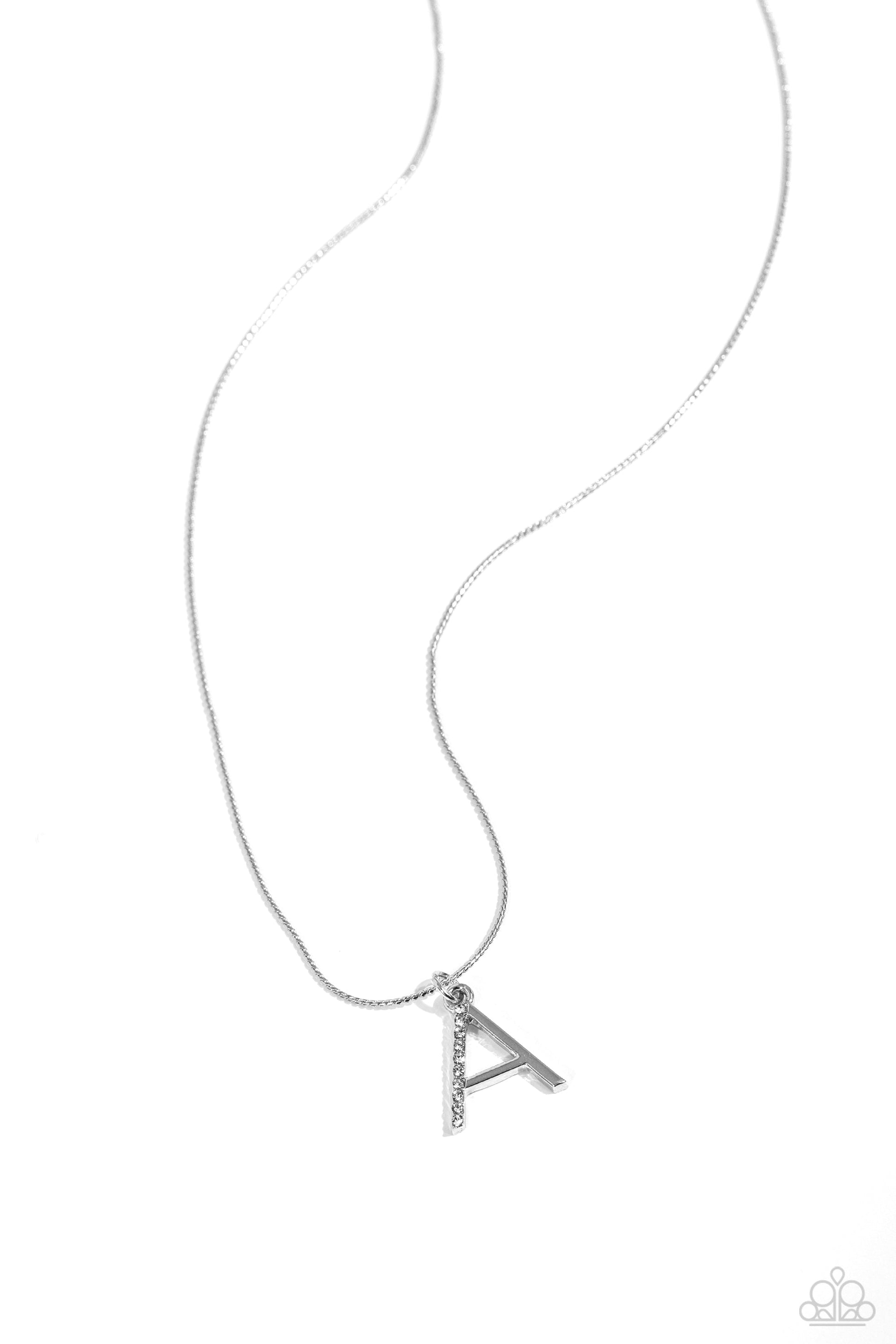 A row of glistening white rhinestones encrusts along one side of a silver letter "A," hovering below the collar from a dainty silver chain for a sentimentally simple design. Features an adjustable clasp closure.