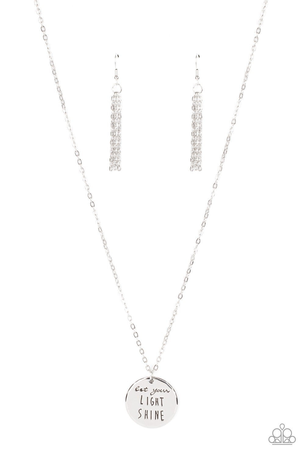 A shiny silver disc is stamped in the inspiring phrase, "Let your light shine," at the bottom of a shiny silver chain. Features an adjustable clasp closure.