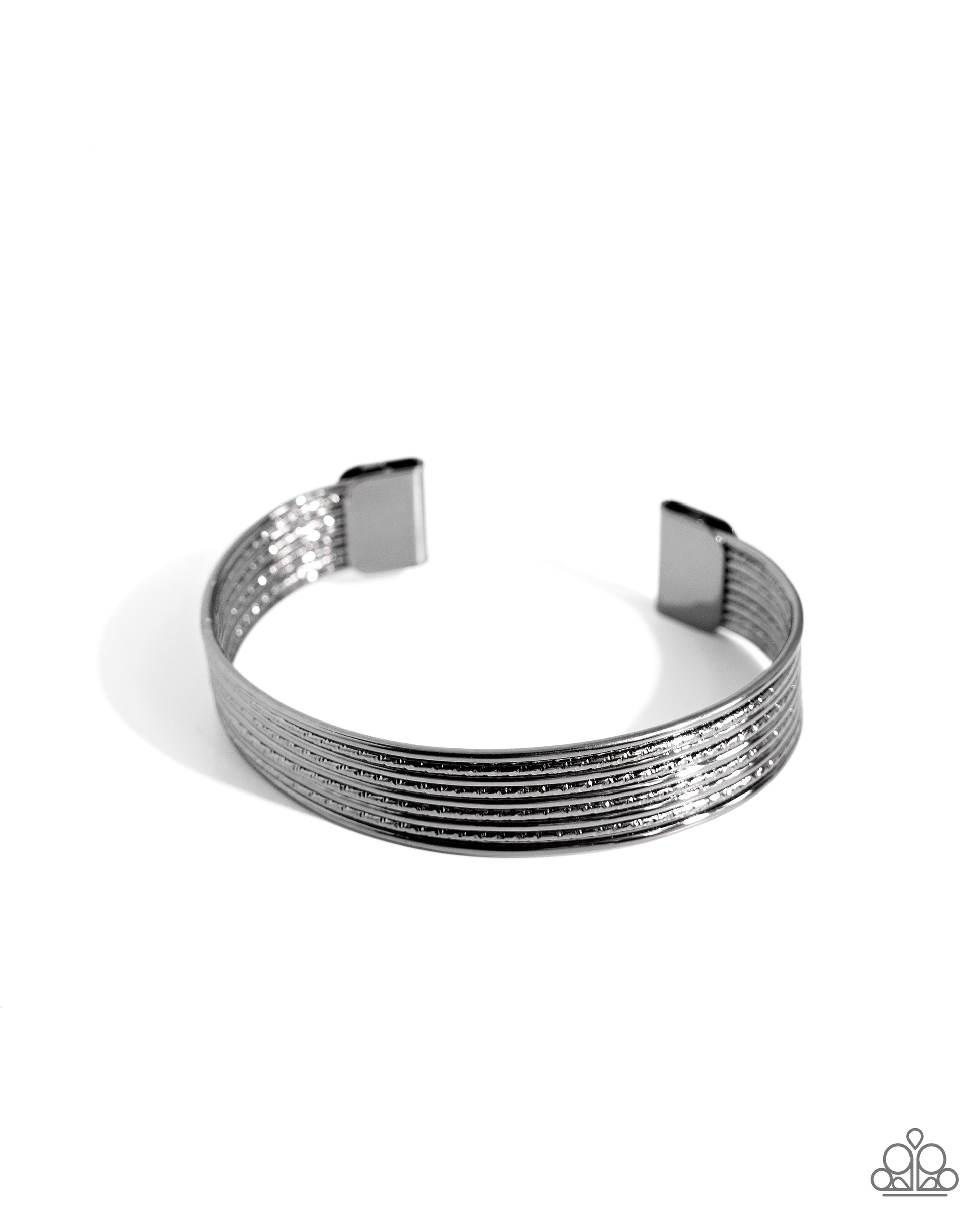 Layer after layer of plain and twisted gunmetal wires stack into an edgy cuff around the wrist, creating an intense metallic centerpiece.
