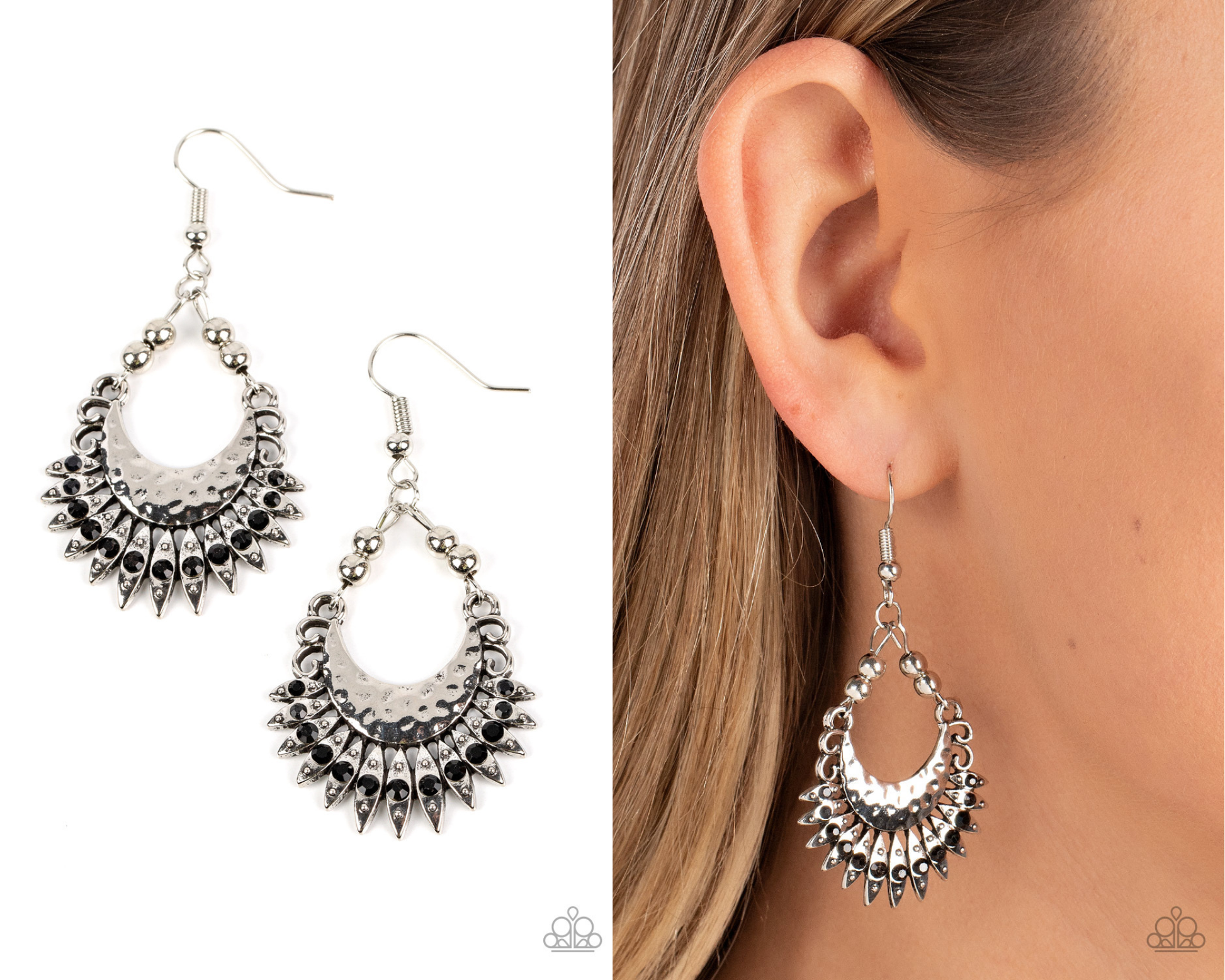 Dotted with dainty black rhinestones, a fan of silver frames flares out from the bottom of a hammered half moon frame that is suspended from silver beaded wires for an artisan inspired fashion. Earring attaches to a standard fishhook fitting.