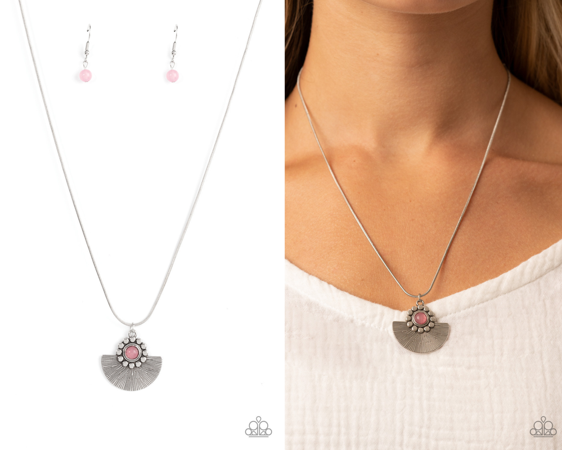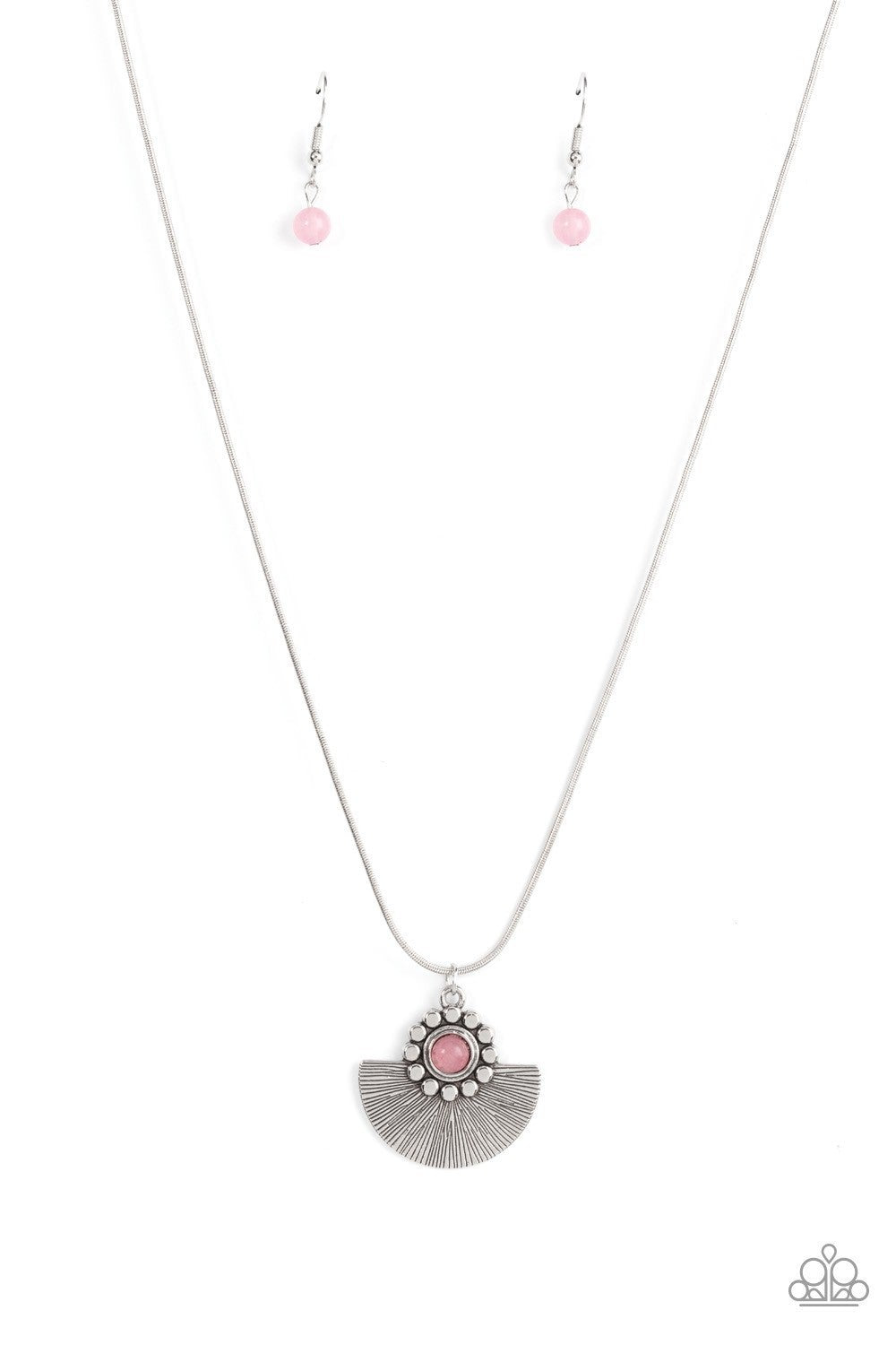 Bordered in a ring of flat silver studs, a mystical pink bead adorns the top of a textured silver half moon pendant that glides along a rounded silver snake chain for an ethereal fashion. Features an adjustable clasp closure.