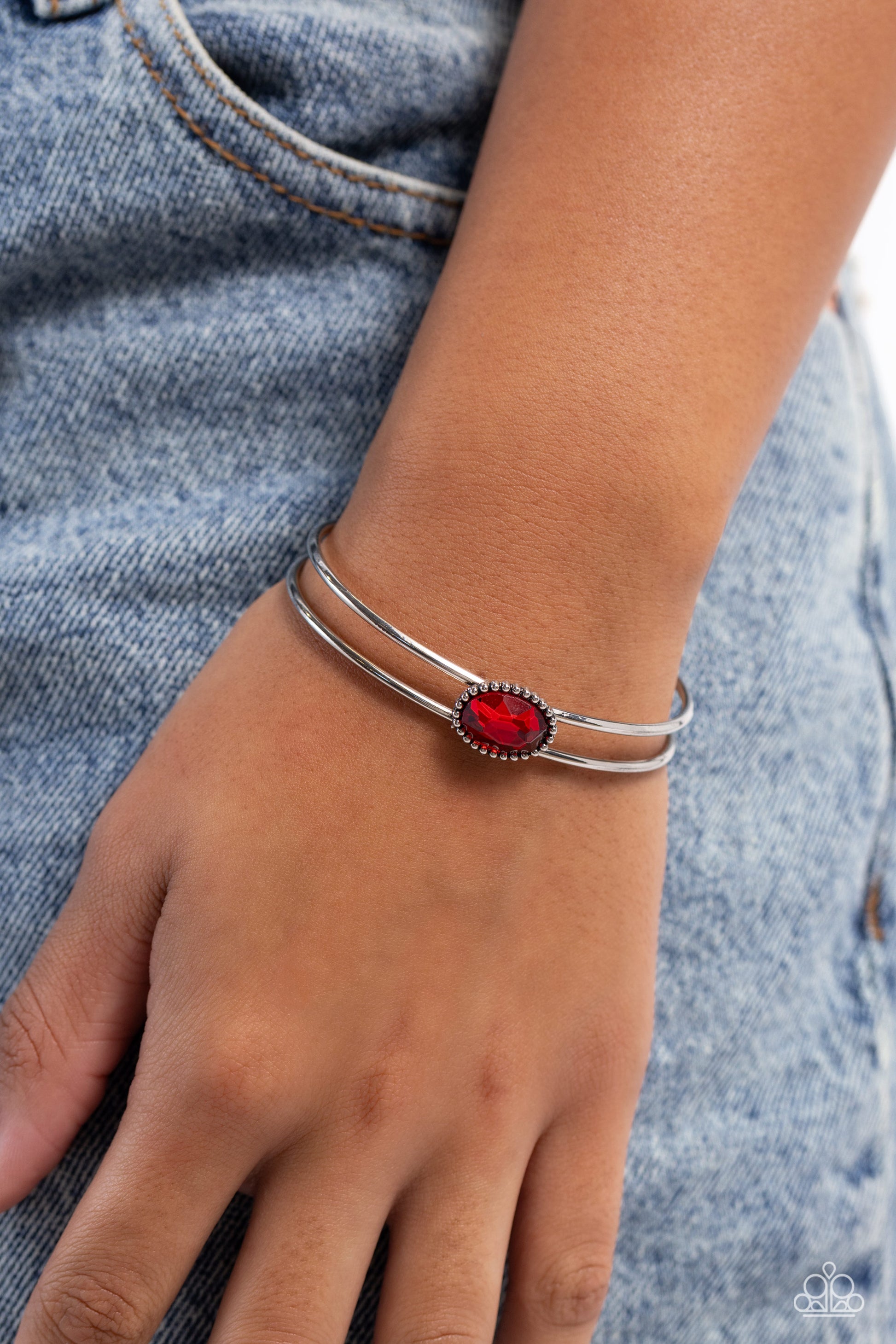 Encased in a studded silver frame, a fiery red gem sits atop a layered silver cuff, creating a mesmerizing centerpiece around the wrist.