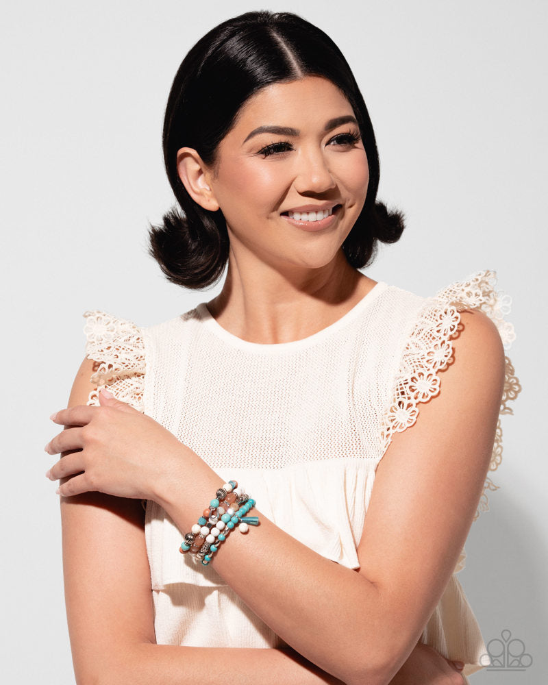 Infused along elastic stretchy bands, a collection of white beads, silver beads in a variety of shapes, white rhinestone-dotted silver ornaments, Bran beads in a variety of cuts, turquoise, white, and brown stone beads, turquoise UV shimmery squares, a silver horseshoe, a solitaire swinging white stone, and a swinging UV shimmery turquoise abstract bead pattern and coalesce atop the wrist for a Santa Fe-inspired stack and pop of color. As the stone elements in this piece are natural, some color variation is normal.