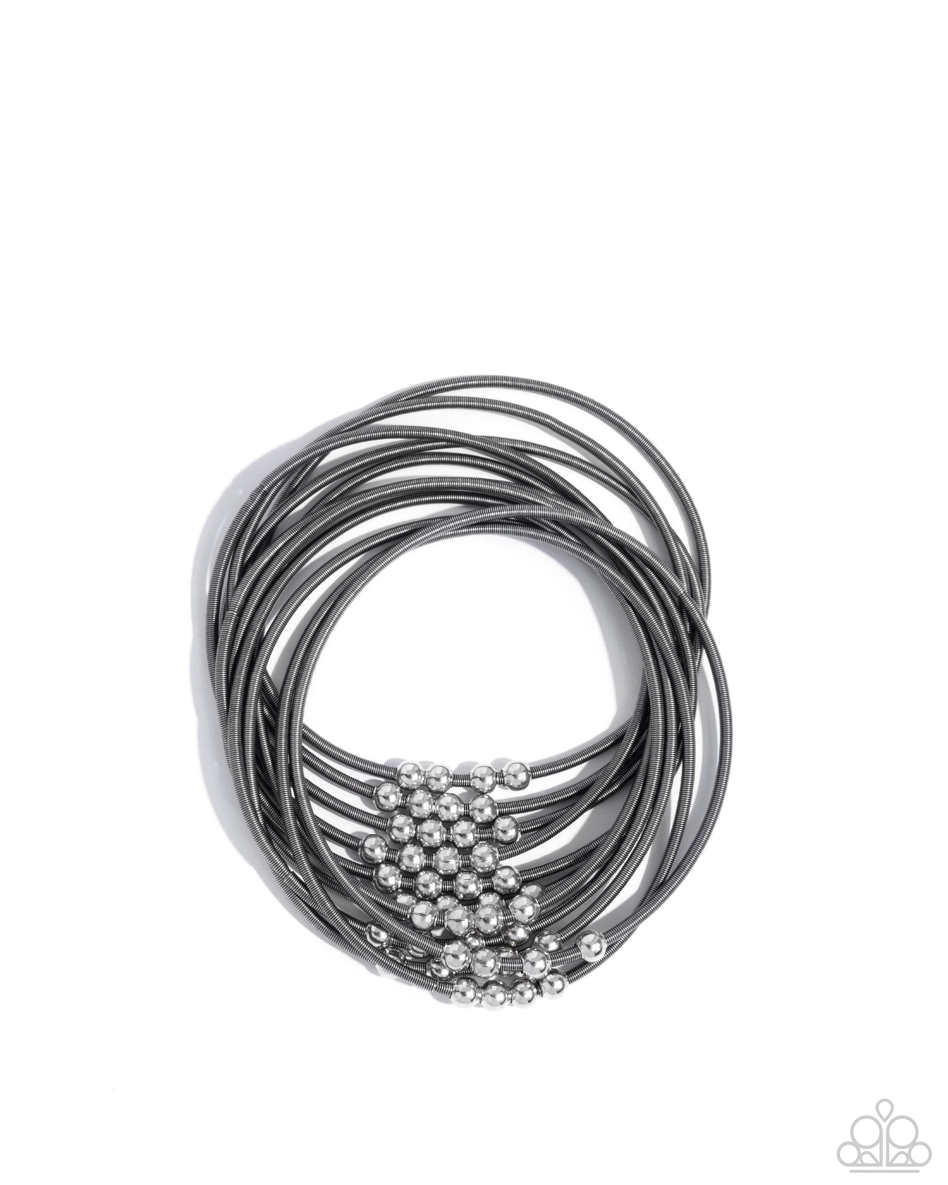 A stack of sleek gunmetal bangle-like coiled strands, each accented with shiny silver beads clustered for added texture and dimension, creates a layered look perfect for any outfit.