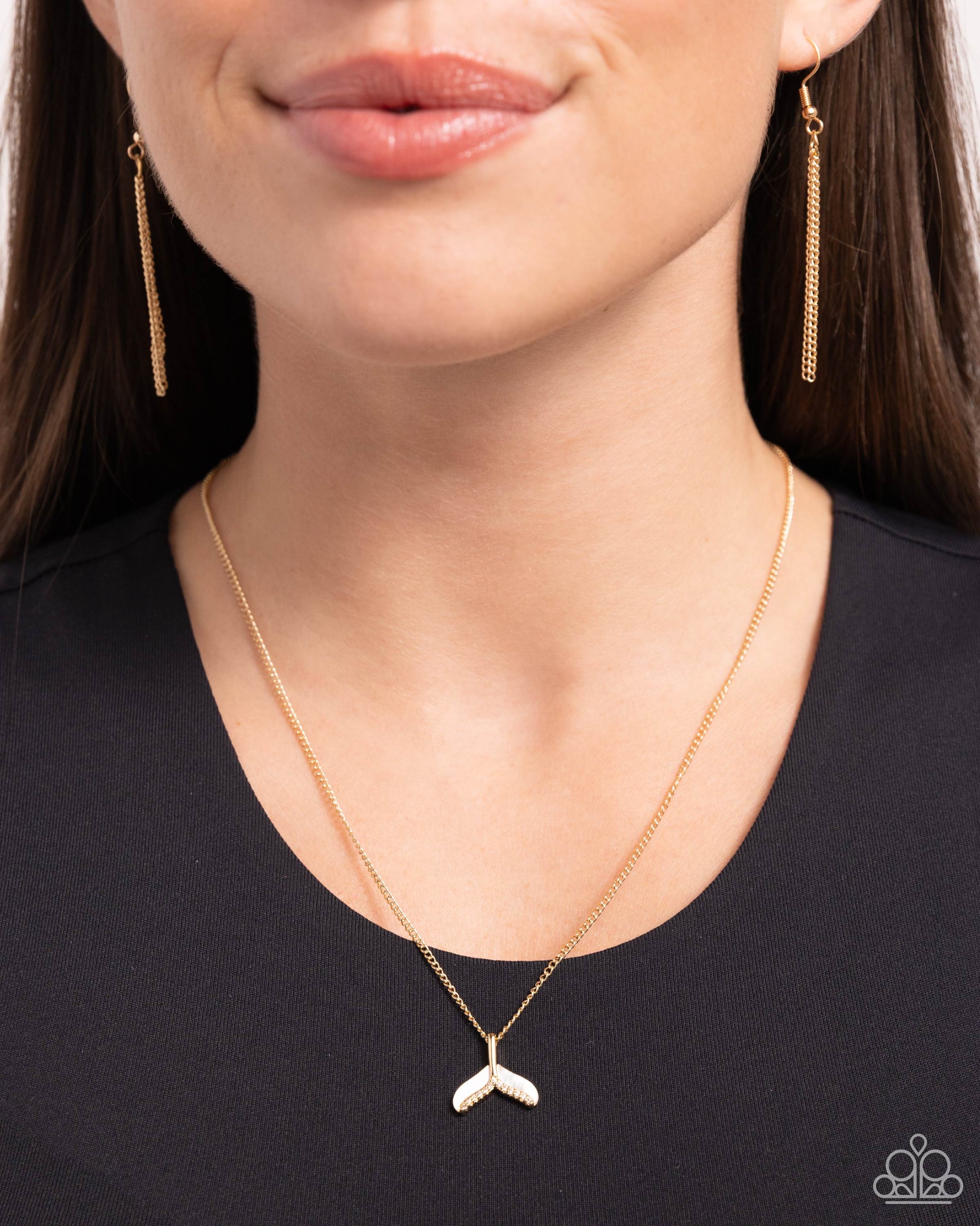 Featuring white shell and white rhinestone accents, a gold mermaid tail pendant glides along a classic gold chain for a mystically mesmerizing statement. Features an adjustable clasp closure.