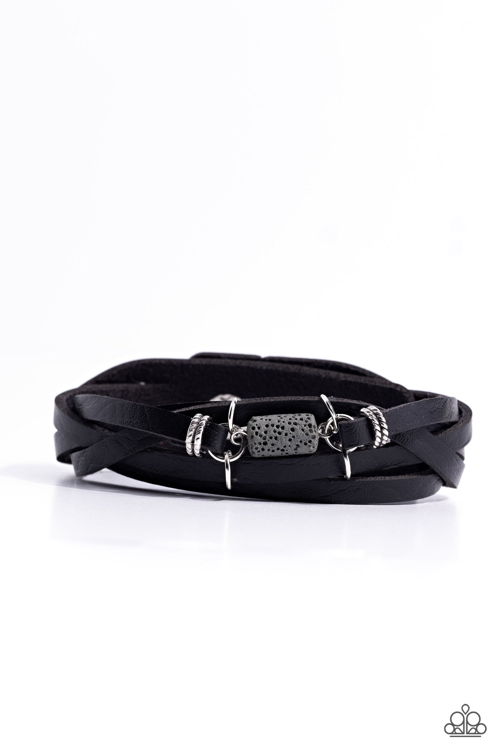 Held together by textured and smooth silver rings, braided black leather strands are adorned with a gray lava rock centerpiece for an earthy finish. Features an adjustable snap closure.