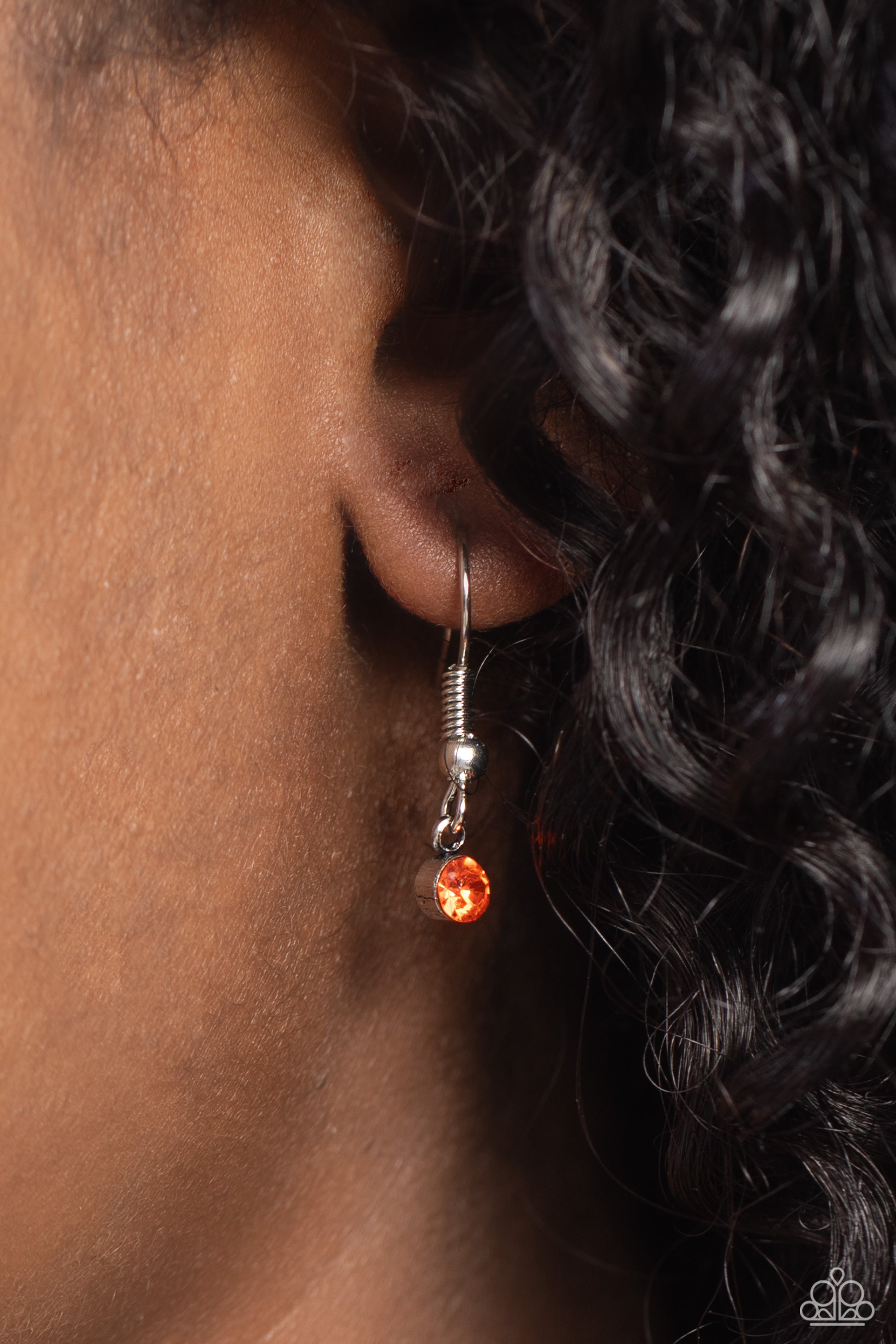 A hammered silver disc, rectangular silver frame, and glittery orange rhinestone swings from the bottom of a dainty silver chain, creating a whimsically layered pendant below the collar. Features an adjustable clasp closure.