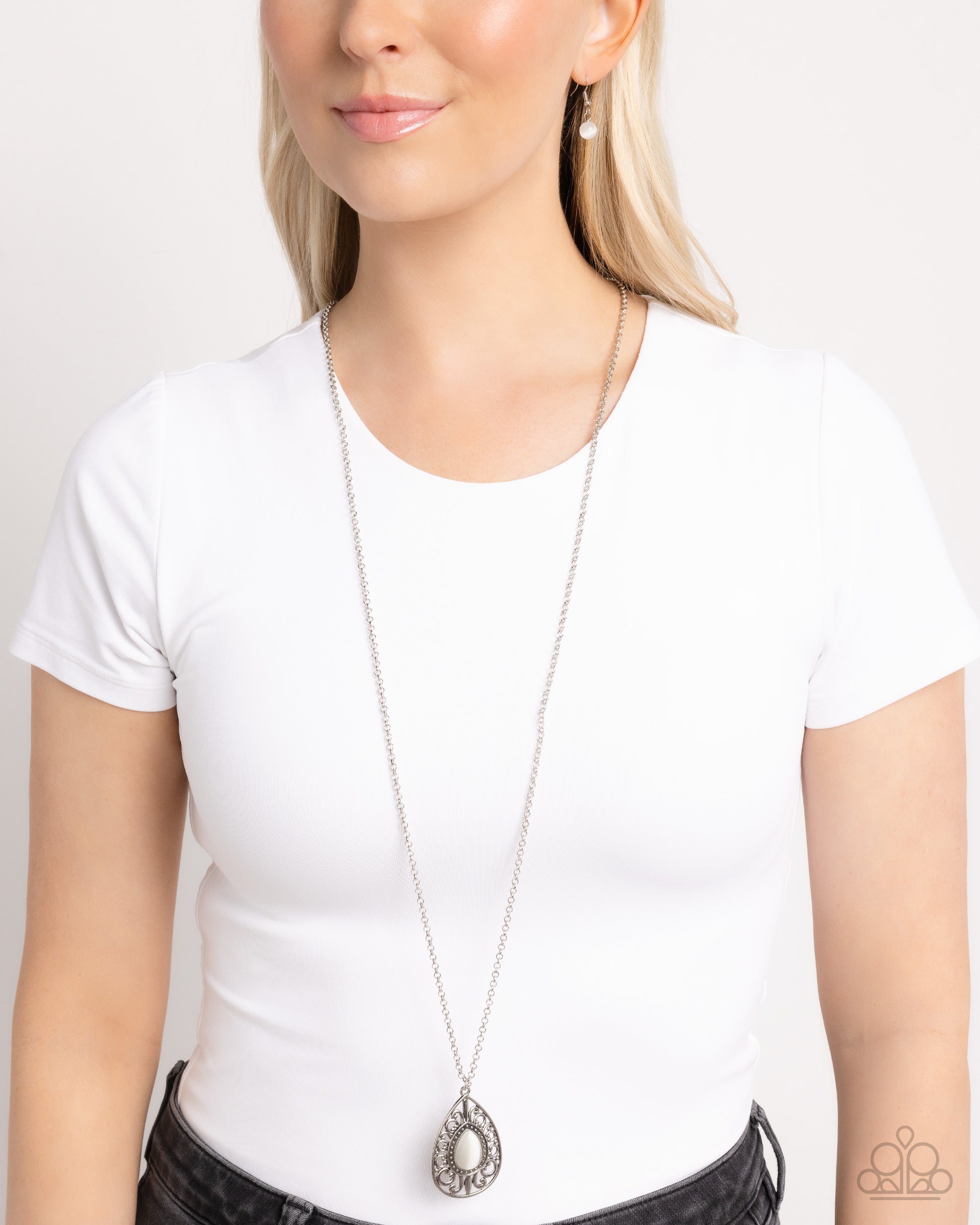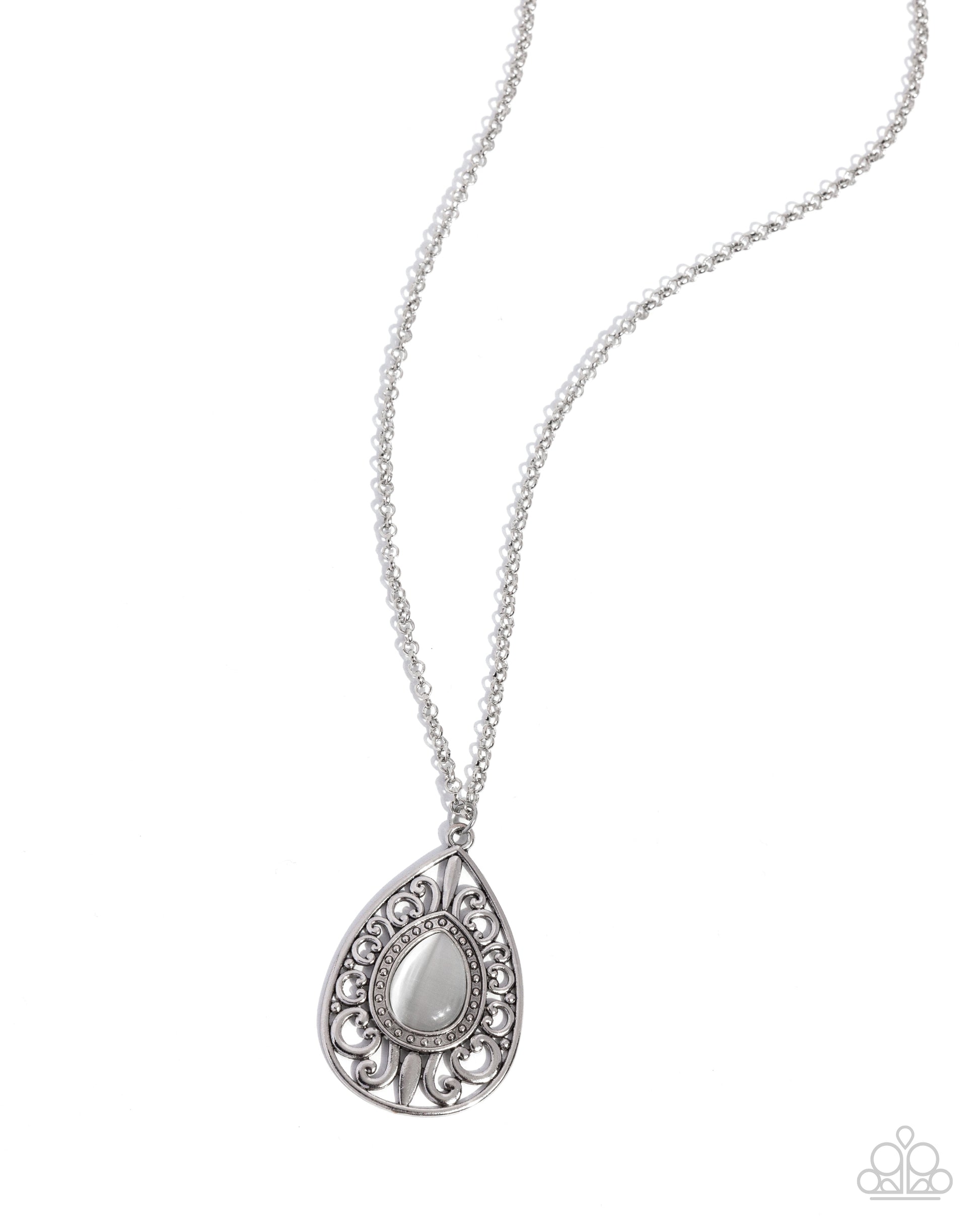 A glowing white moonstone is pressed into the center of a silver teardrop pendant swirling with regal filigree for a regal finish. Features an adjustable clasp closure.