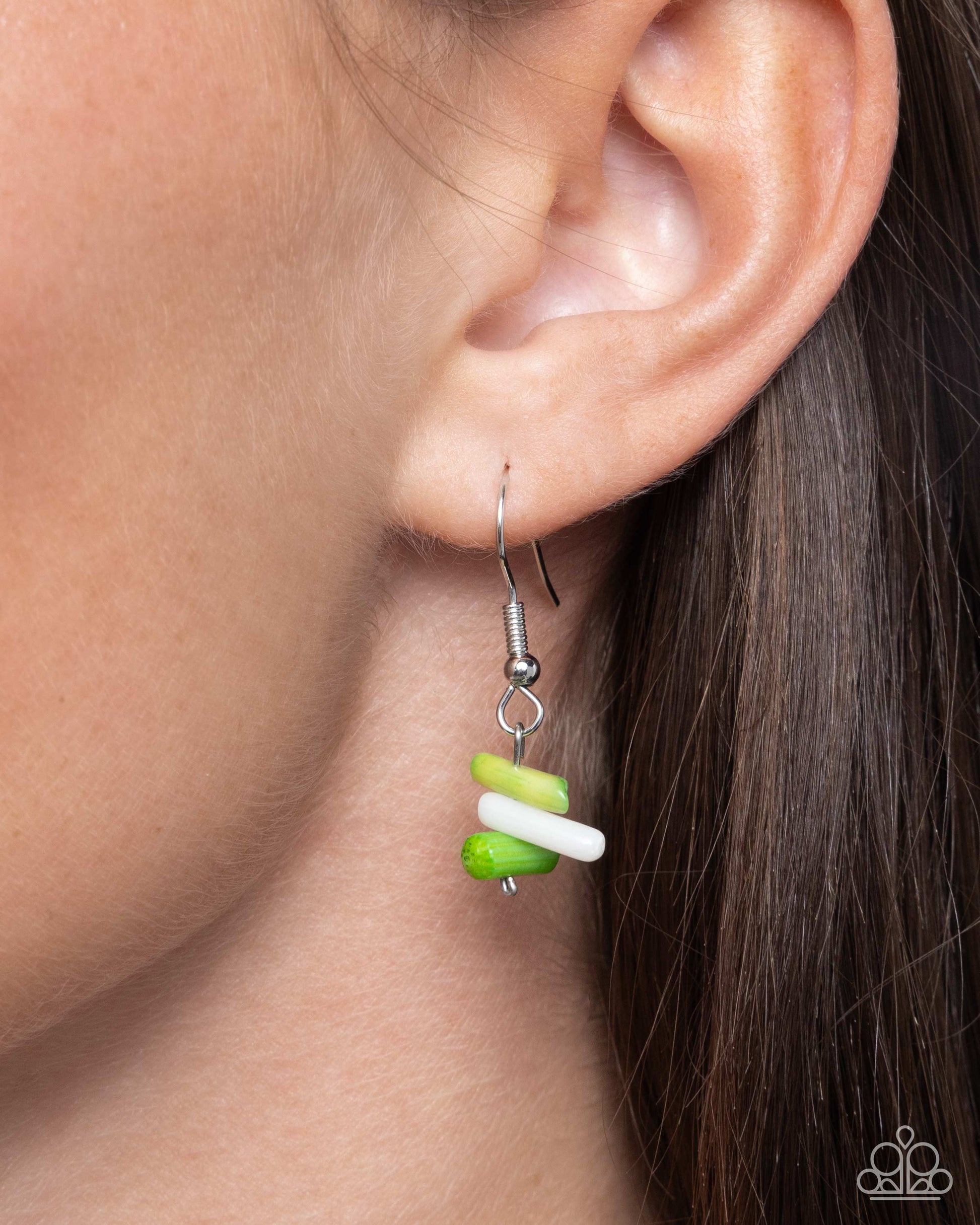 Infused along an invisible string, a collection of silver, silver cylindrical, and Apple Green and white chiseled beads twist and warp around the neckline for an artistical, abstract display. Features an adjustable clasp closure.