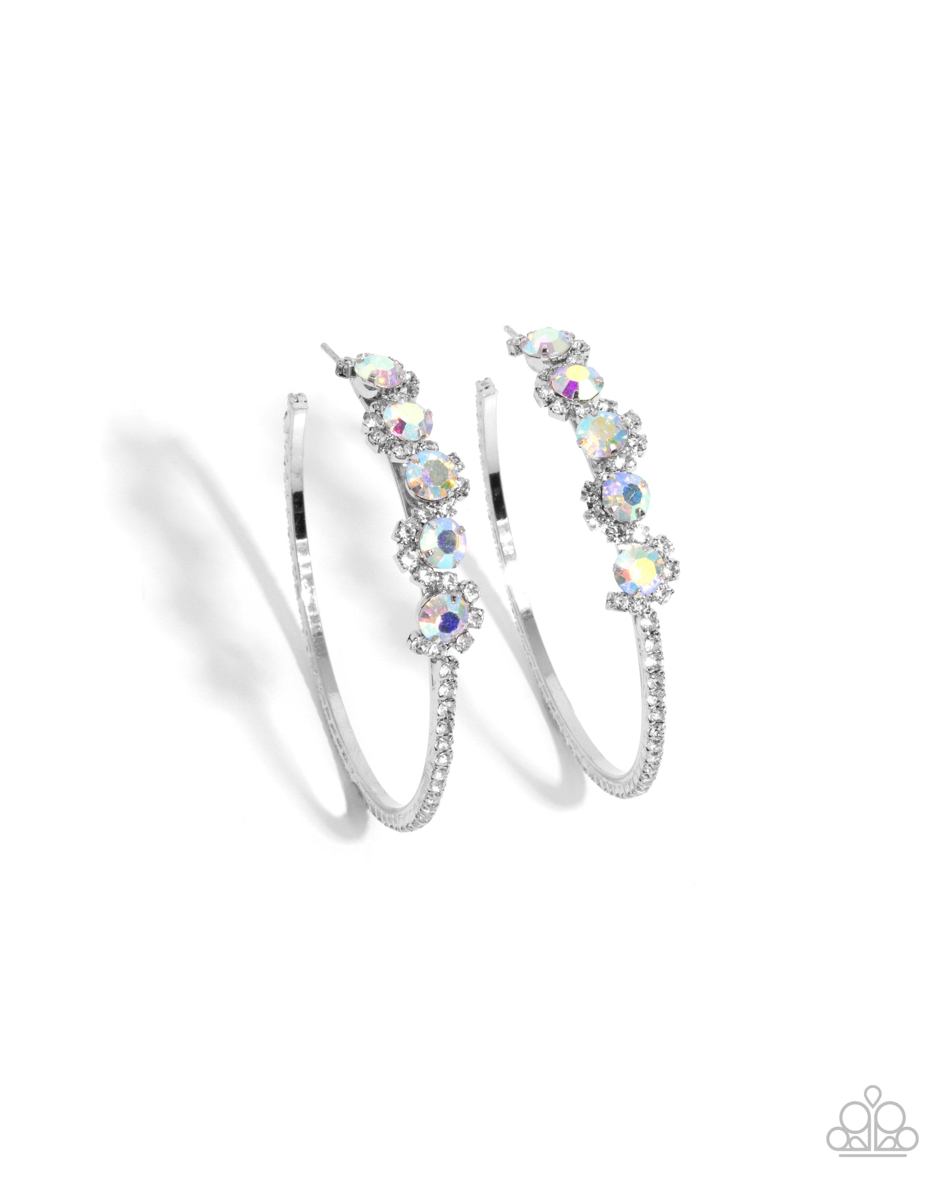 Encrusted along a thin oversized silver hoop, glistening white rhinestones in square fittings curl around the ear. Additional ribbons of white rhinestones in square fittings dramatically loop around faceted iridescent gems towards the top of the ear, resulting in an explosion of sparkle and class. Earring attaches to a standard post-fitting. Hoop measures approximately 2 1/2" in diameter. Due to its prismatic palette, color may vary.